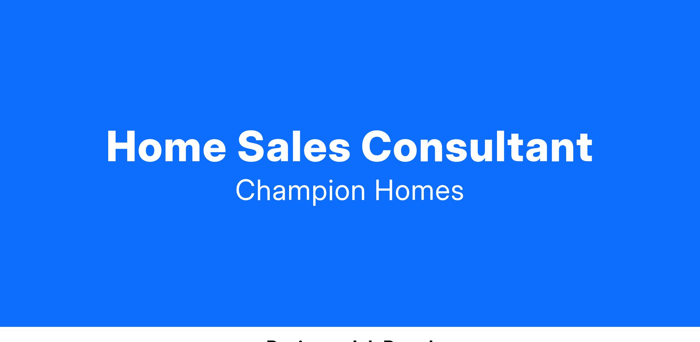 Champion Home Builders is proud to be an equal opportunity employer. All qualified applicants will receive consideration for employment without regard to race, color, religion, gender, gender identity or expression, sexual orientation, national origin, genetics, pregnancy, disability, age, veteran status, or other legally protected characteristics. Champion Home Builders participates in the E-Verify Program.
