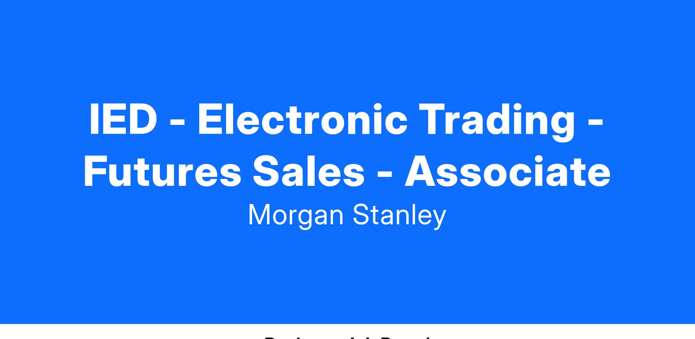 Position focuses on a range of money managers including but not limited to Hedge Funds, Asset Managers, CTAs and Family offices. (Morgan Stanley Electronic Trading) MSET sales role is client facing. A successful candidate would directly manage relationships with traders, portfolio managers, technologists across a wide range of global futures markets.
