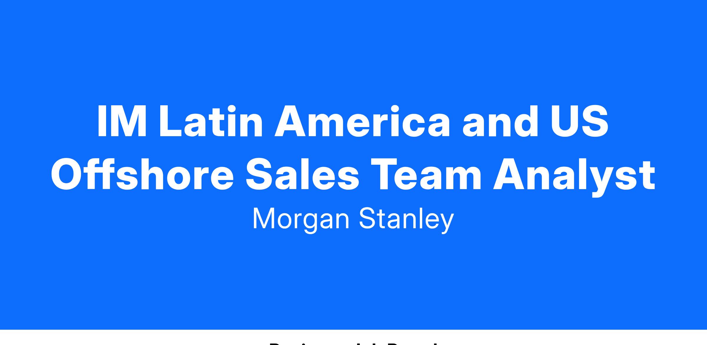The individual would be part of the Latin America and US Offshore Sales team at Morgan Stanley Investment Management. The individual will support an external sales team with maintaining business relationships with institutional and intermediary clients. The role would have additional sales responsibilities covering financial advisors, private bankers and other US Offshore intermediary clients in Florida, New York, Texas and California. The position will be based in Miami, FL.