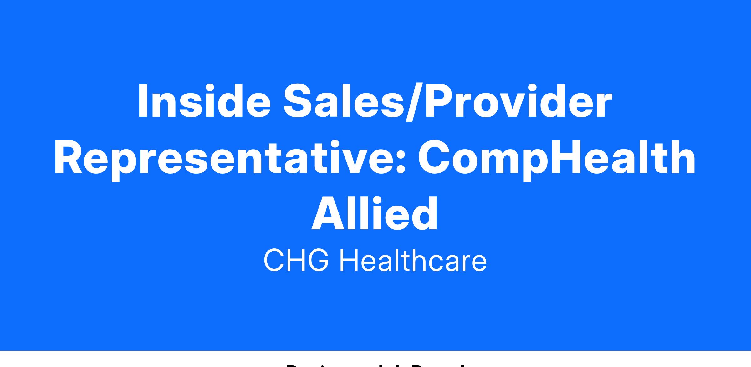 As an Inside Sales Representative in the CompHealth Allied Division, you will reach out to healthcare providers, learn their career goals, then match them with a healthcare facility that needs their services.
