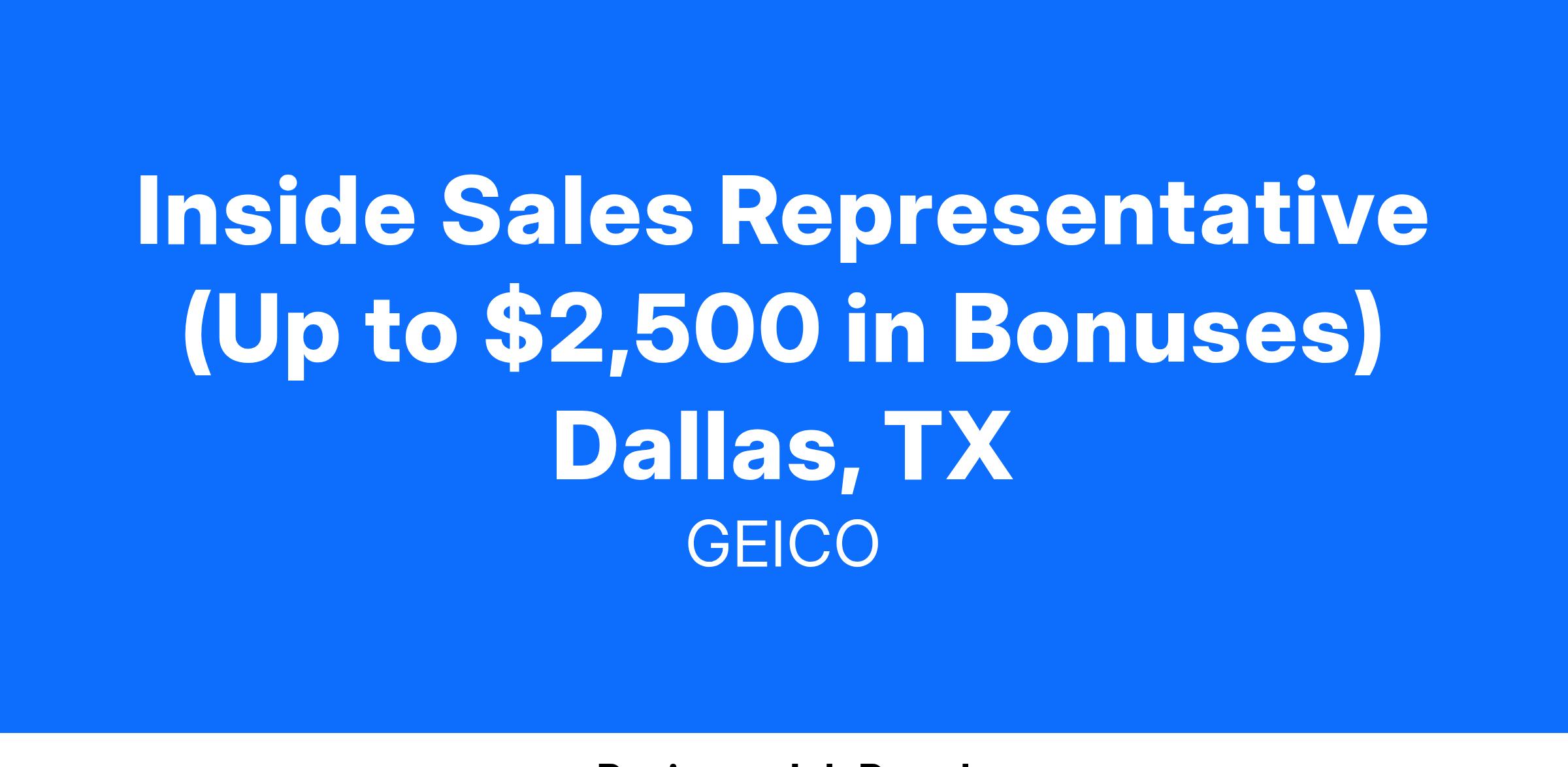 As a Sales Representative, you’ll build rapport with customers without making a single cold call. Our Sales Representatives use compassion and persuasion skills to prepare insurance quotes, advise customers on coverage, and convert quotes into new policies. GEICO offers a career with plenty of development opportunities, where you will feel seen, challenged, and can make an impact from the start. If you enjoy working in a fast-paced, competitive environment and have a passion for sales, this is your opportunity to be part of a great team!