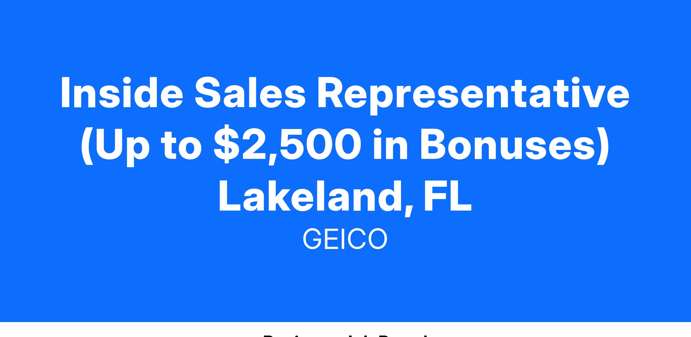At GEICO, our associates are the heart of our company. We’re looking for Sales Representatives for our Lakeland, FL office who are driven, solution-oriented, and ready to contribute to our company’s success. We’re seeking outstanding associates who want to kickstart a fulfilling career with one of the most innovative auto insurers in the U.S.