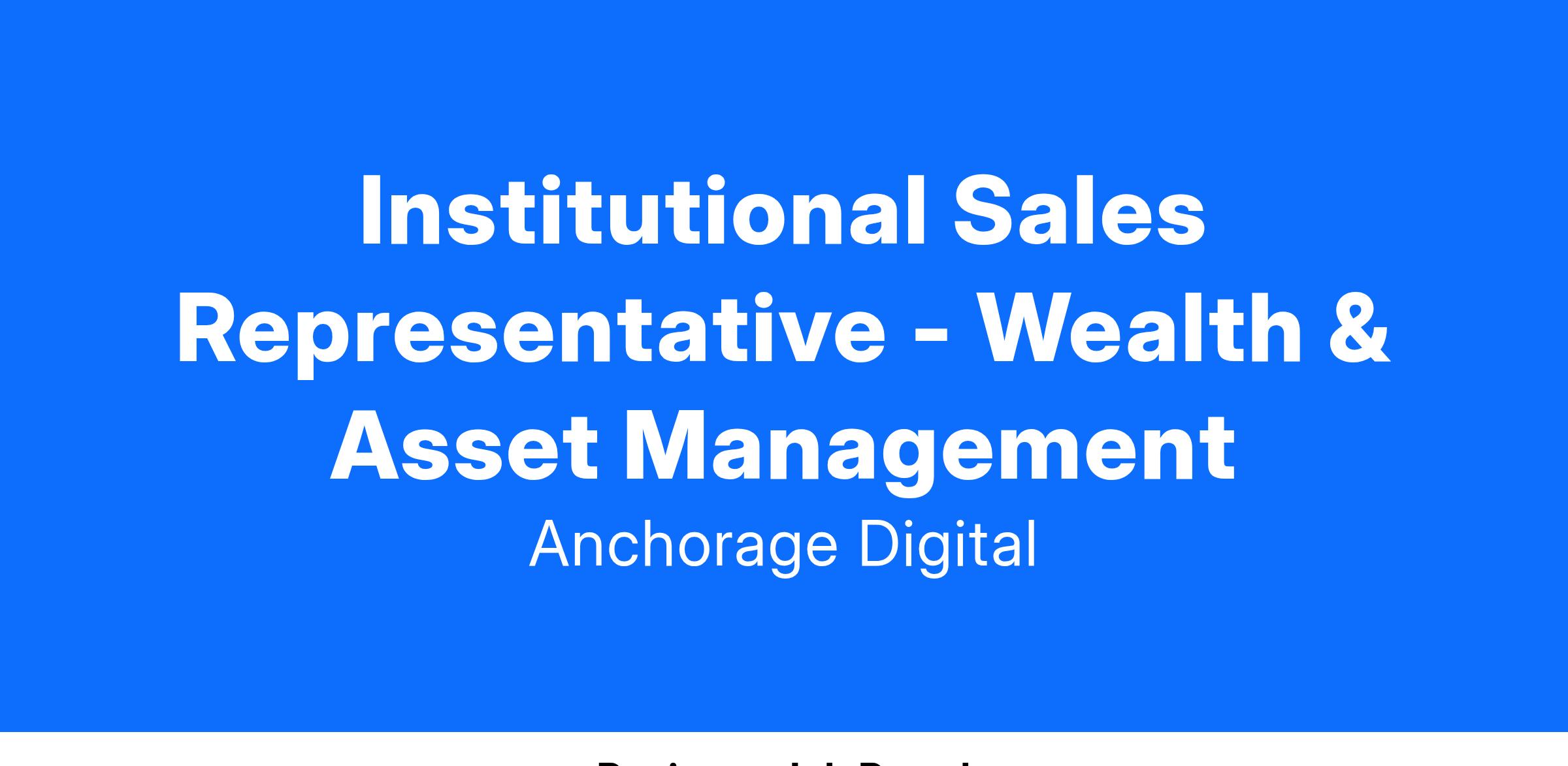 Anchorage Digital is looking for a highly motivated and experienced Institutional Sales Representative to join our team. As a member of the sales team, you will be integral to driving forward the growth and future success of the Anchorage Wealth Management custody and trading platform for RIAs, Asset Managers, Broker Dealers, Banks and other financial institutions.