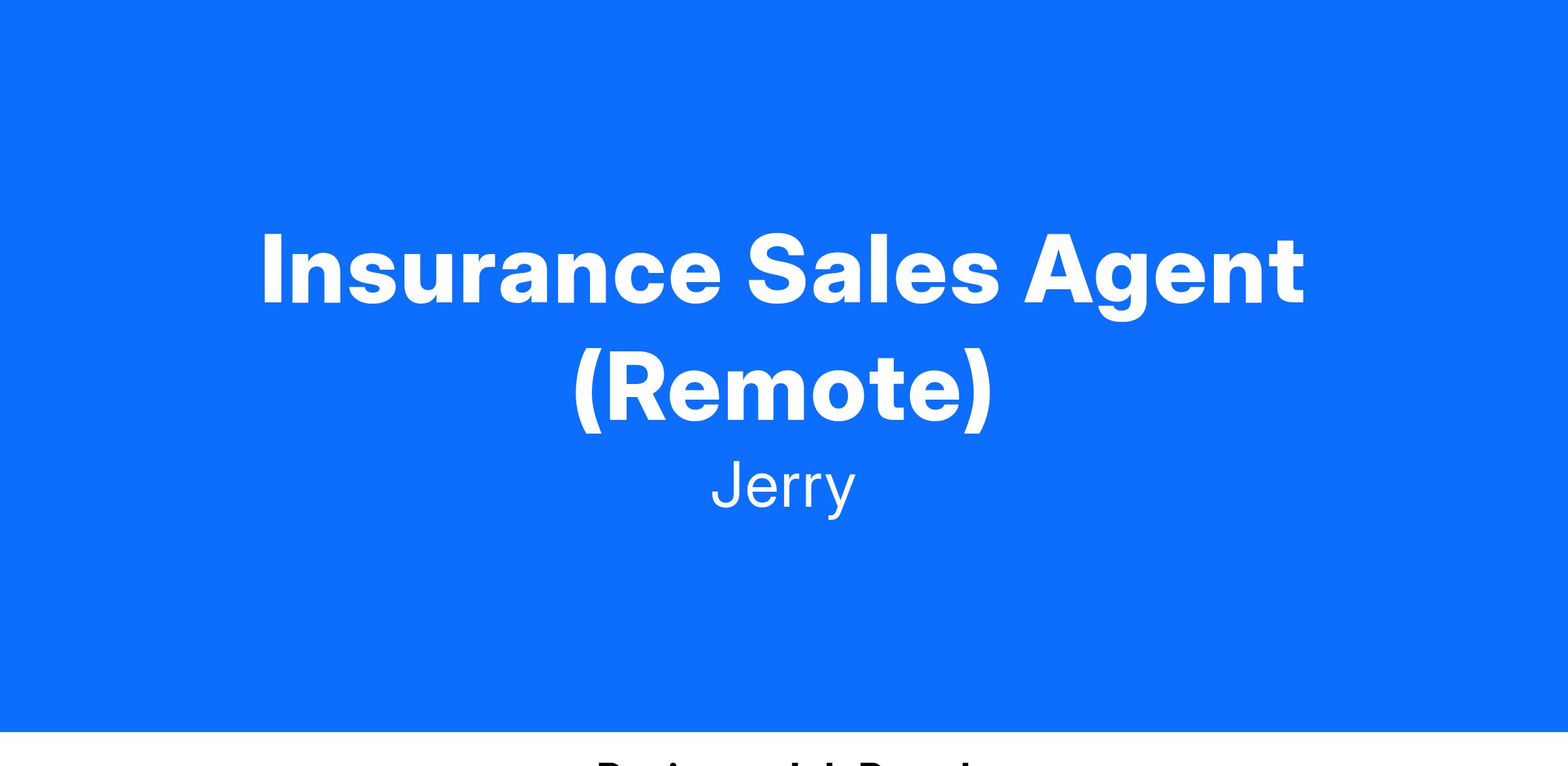 We are looking for a Remote Insurance Sales Agent who can work weekends and evenings to join our growing team! This role is 100% remote, we provide all work equipment needed. In this role, you will be responsible for helping prospective customers understand and choose the right insurance policies for them from one of Jerry's 55+ insurance carrier partners. All of our customers come to us directly from our mobile or web app, so no outbound calls needed. If you are looking for an opportunity to make a measurable difference in the lives of millions, we'd love to hear from you!
