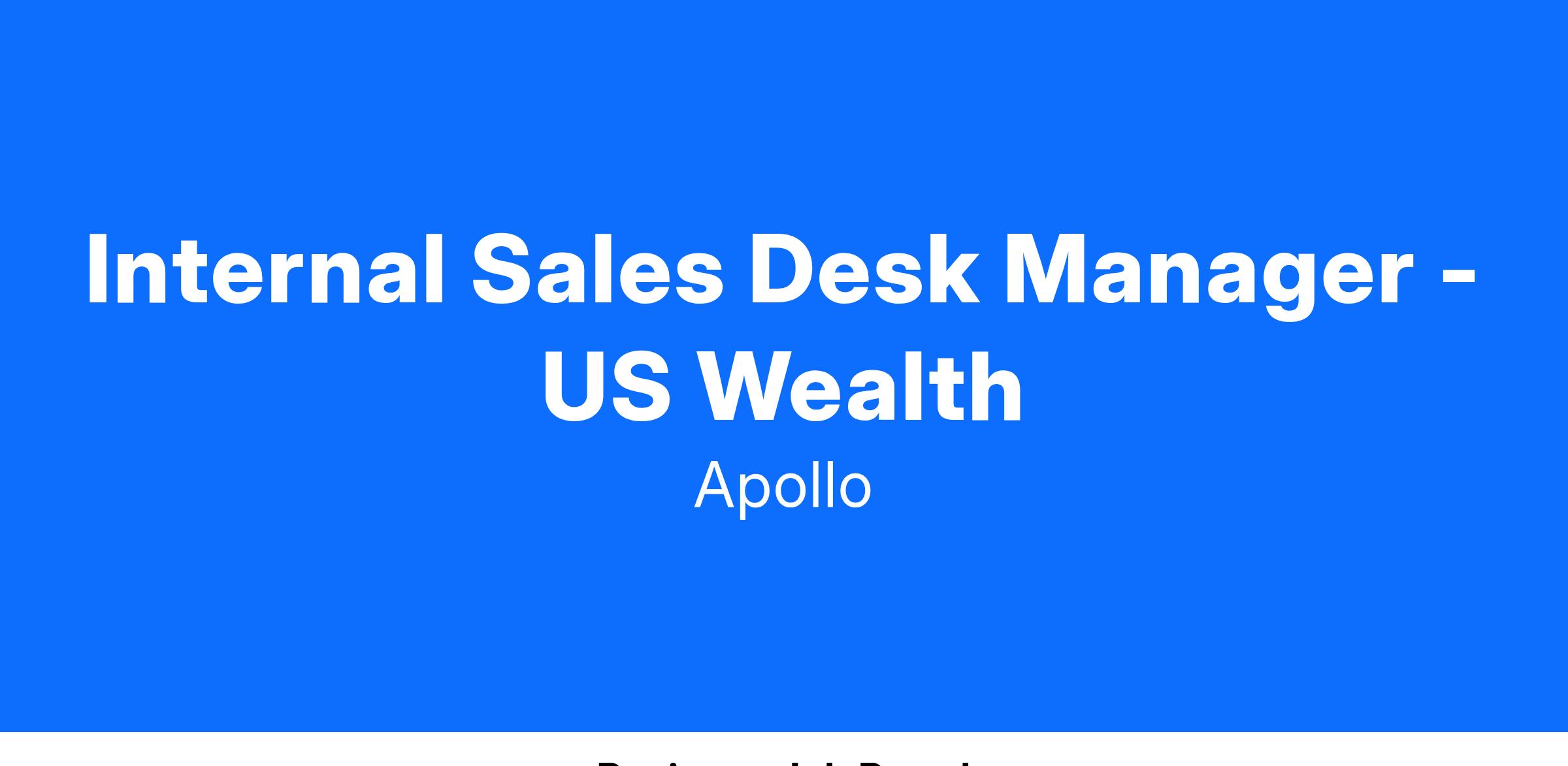 The Internal Sales Desk Manager will be responsible for managing a range of Analyst and Associate level talent within the Global Wealth Management Solutions business at Apollo. The professionals on the Internal Desk will span multiple channels (US Independent and PB/Wire primarily) based across the firm’s NYC, Miami and El Segundo office locations (strategically aligned to the region/territory that they support).