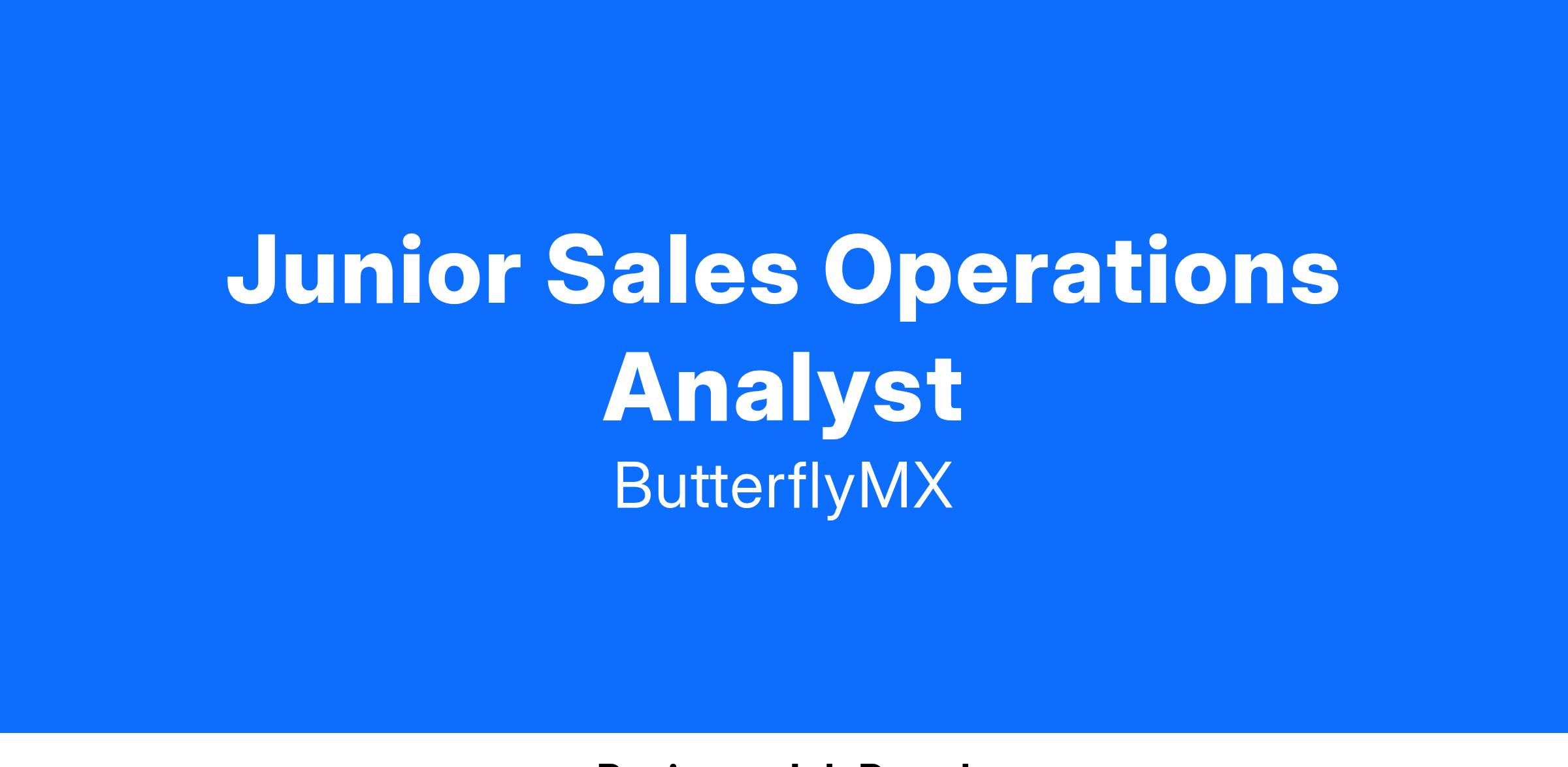ButterflyMX is hiring a Junior Sales Operations Analyst to join our growing Sales Operations Team! As a Sales Operations Analyst, you will support the sales team by analyzing data, streamlining processes, and providing insights that drive sales performance. You will work closely with cross-functional teams to enhance our sales operations and contribute to the overall success of the organization. You will also support and implement company-wide initiatives designed to advance alignment with, and achievement of, the sales teamβs strategy and objectives.