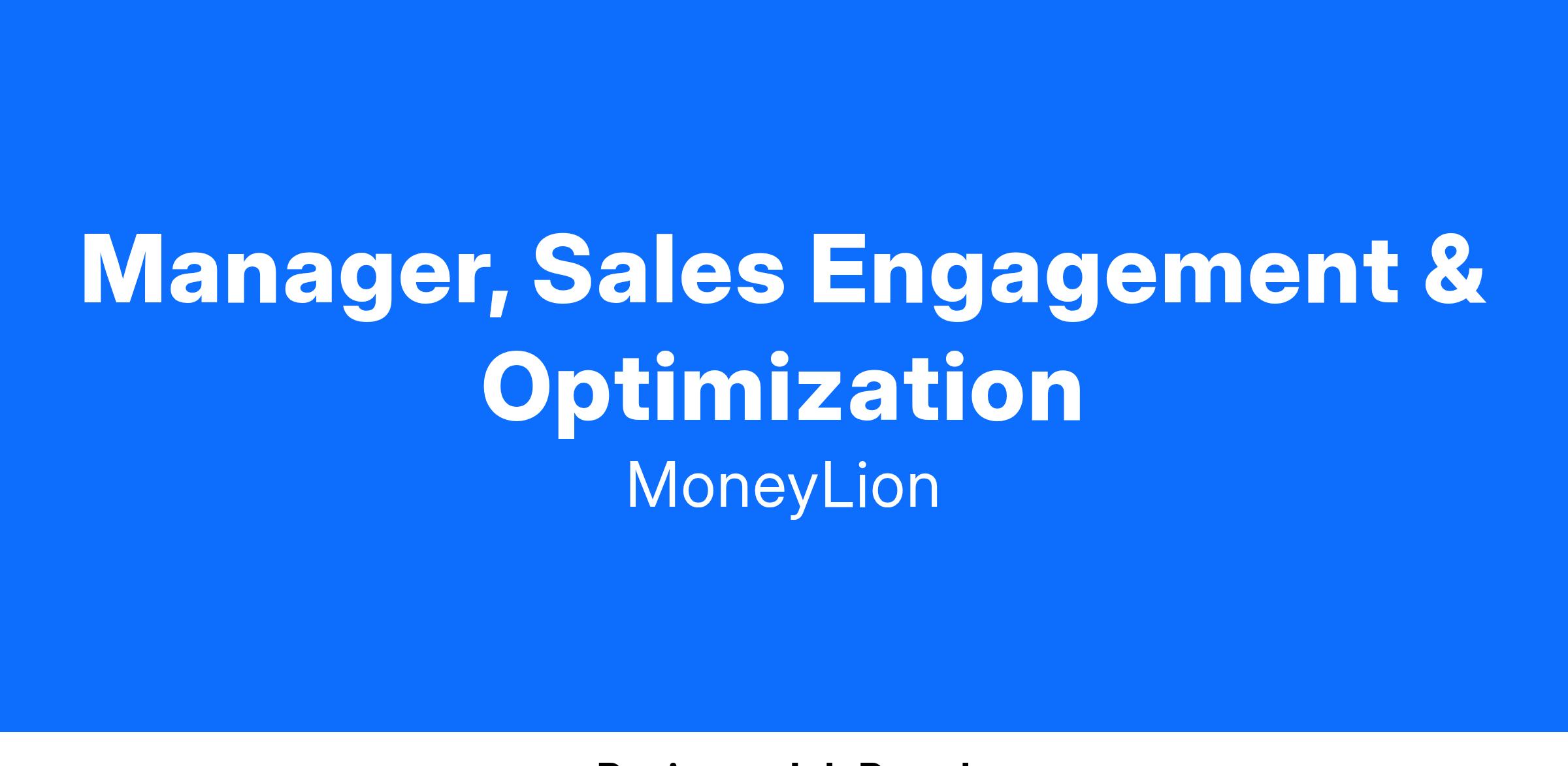 The annual base salary for the Manager, Sales Engagement & Optimization is expected to be between $80,000 to $100,000. Base salary is one component of MoneyLion's total compensation package, which includes, 401(k) match, multiple health insurance options, disability coverage, life insurance, and unlimited paid time off for salaried positions. Actual salaries will vary based on a candidate’s qualifications, experience, skills, and competencies related to the role.