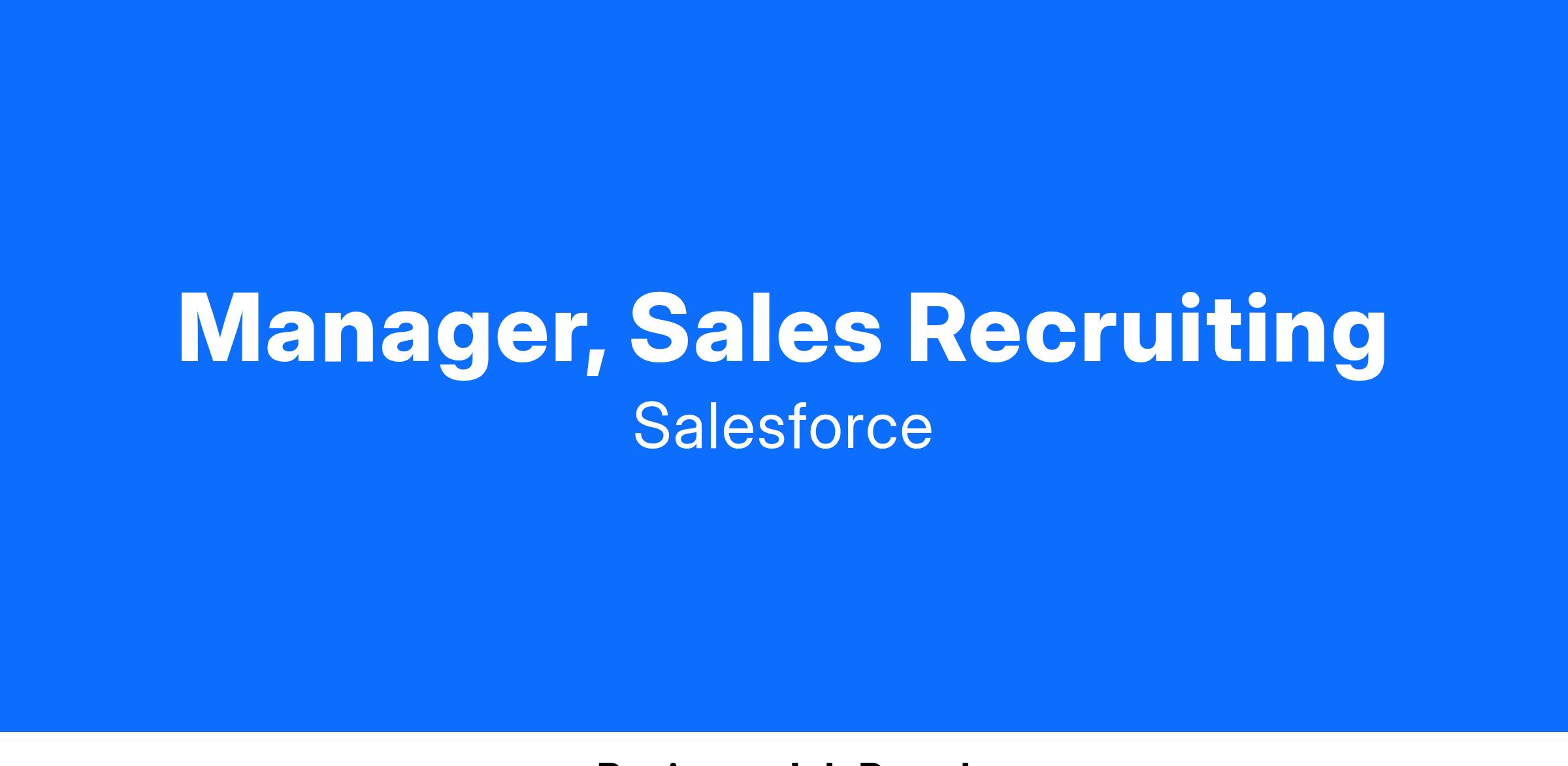 The Manager, Sales Recruiting will work directly with Salesforce leaders to advise & support select organization’s talent needs. This person will lead, manage, inspire and motivate a team of Recruiters to deliver against recruiting goals and drive both short and long-term initiatives. The ideal candidate is an exceptional leader and has a strong commitment to the collective and individual success of their team.