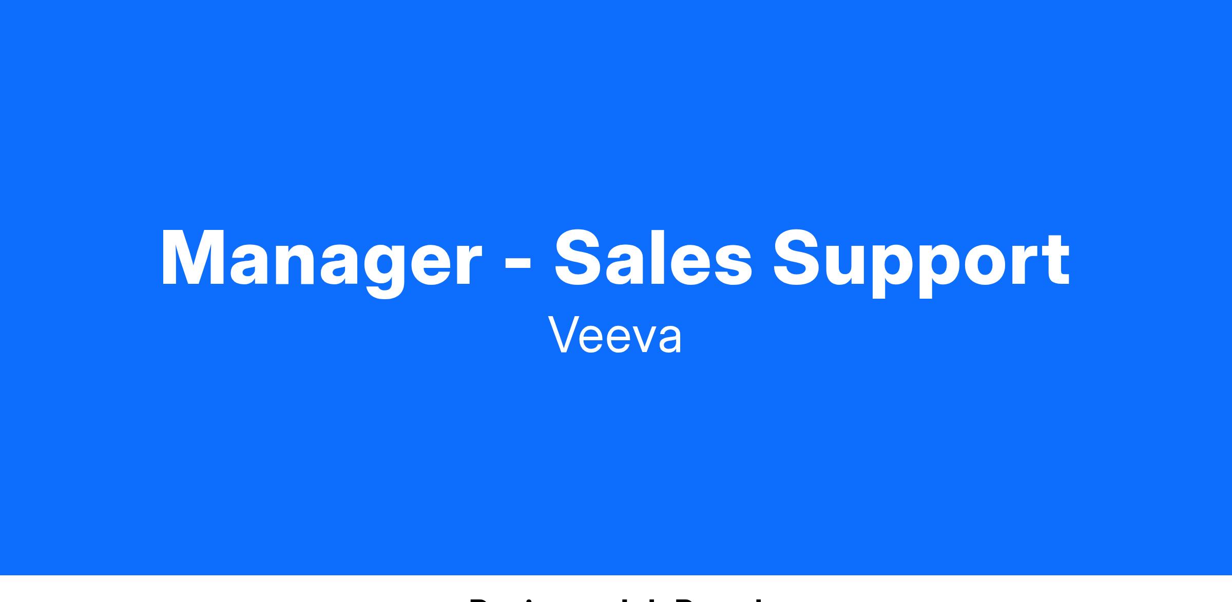 The Manager, Sales Support will lead a team of analysts supporting Veeva’s North American sellers and customers in opportunity, quote, and renewal management. Your primary responsibility is overseeing the process of creating, approving, and routing order forms for Veeva’s subscription business with quality and speed. An ideal candidate has several years of people leadership experience and has worked in a high-volume SaaS environment in sales or operations.