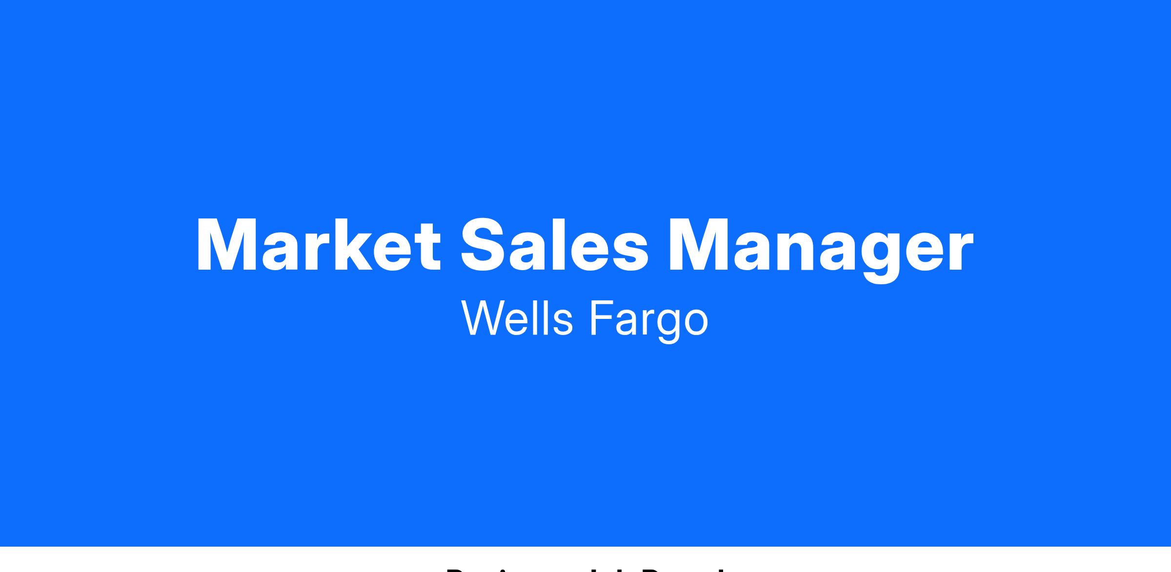 Wells Fargo is seeking a Market Sales Manager in Wealth and Investment Management as part of Wells Fargo Advisors. We are seeking a driven and goal-oriented professional with extensive experience in growing asset flows and fostering liability growth. The Market Sales Manager will have a proven ability to partner with leadership share best practices, new wealth management solutions and help advisors grow. Learn more about our career areas and lines of business at wellsfargojobs.com