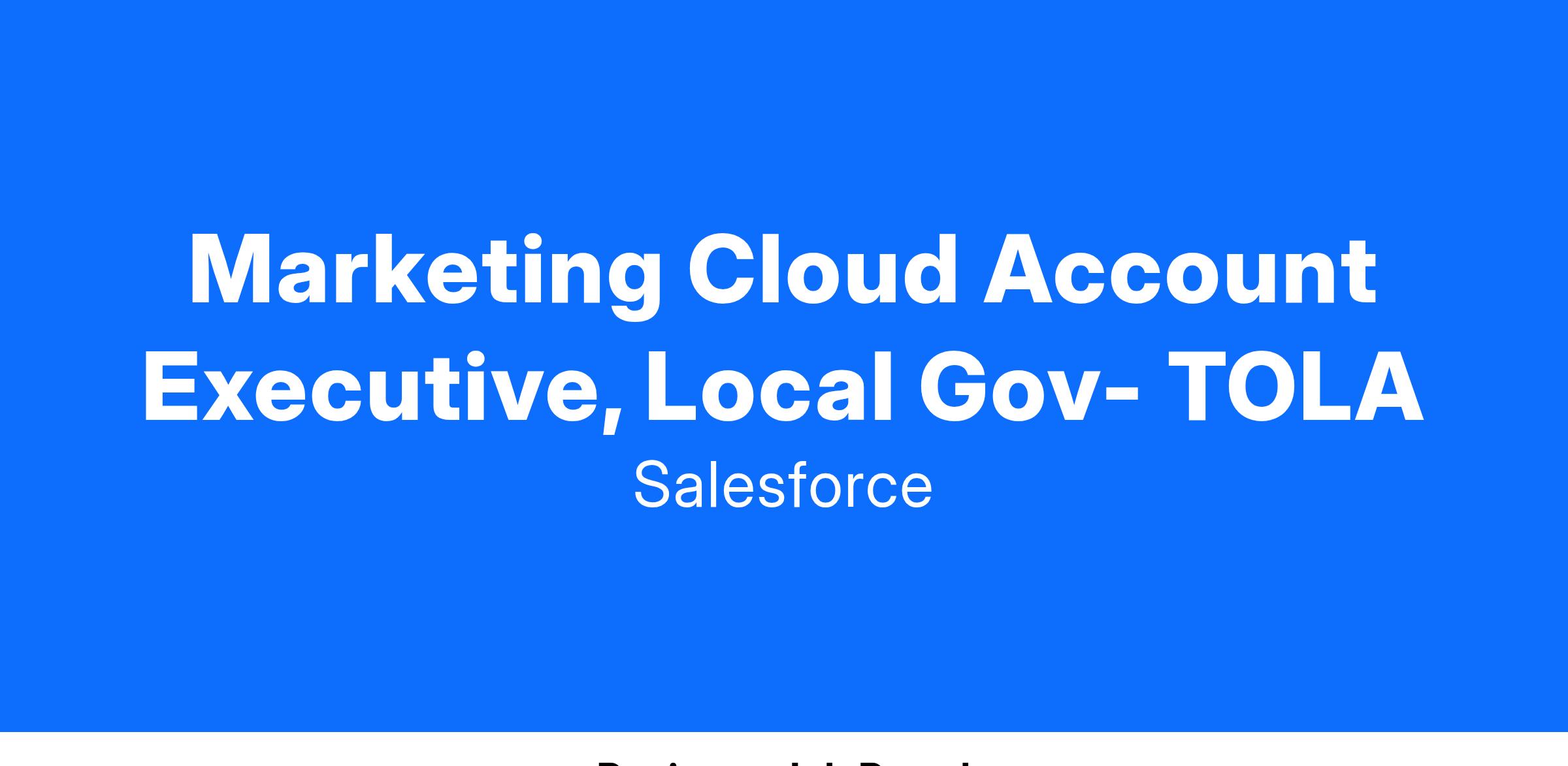 The Salesforce Digital AE is a subject matter expert and trusted advisor who works with Local Gov prospects and customers to evangelize marketing platform solutions that deliver relevant, personalized journeys across channels and devices. We are seeking an experienced quota-carrying sales executive who can work both as part of a broader Account Team and as an Individual Contributor driving self-generated sales opportunities focused on the full Salesforce Marketing technology stack. If you have a passion for being at the cutting edge of Local Gov engage with their constituents, we want to speak with you!
