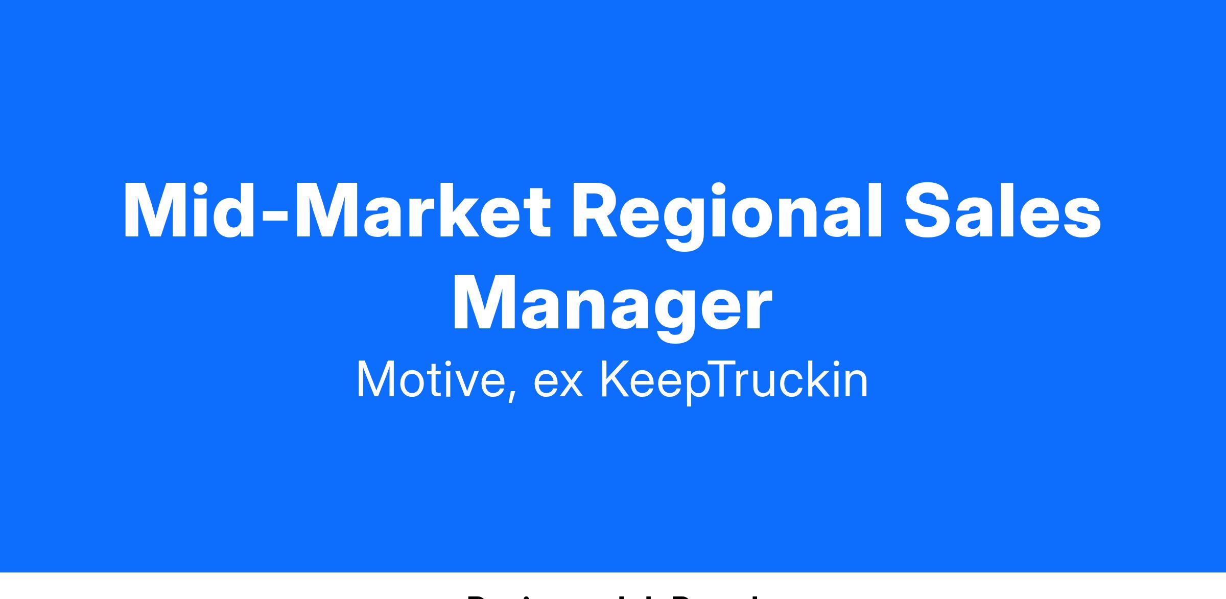 Motive has three segments: SMB, Mid-Market, and Enterprise. Mid Market is defined as any company with a total fleet size of between 50-149 vehicles. To put that in perspective, it’s a hybrid sales org where the AE’s have approximately 2+ years of quota carrying experience, are owning the full sales cycle, with ability to sell remotely as well as travel onsite. The sales process involves a technical win, oftentimes with a hardware/software trial (POC). The AE’s are paired with Sales Engineers, while the CSM team owns renewals. There are currently 4 RSM teams, with a target headcount of between 6-8 AE’s per RSM. The organization is based on account sets and round robins, not geographic territories.