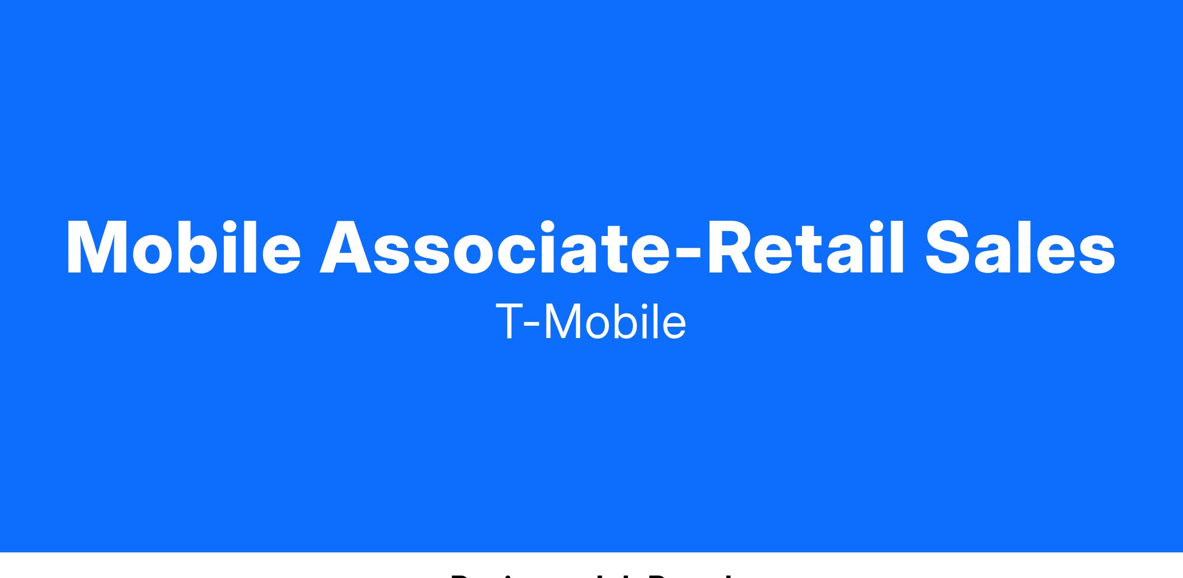 Mobile Associates (MA) work as a member of a Retail Team of Experts to bring the T-Mobile brand to life. They're brand ambassadors who build energy and excitement around our products and services. They are passionate about the connected world and thrive in a fast-paced environment, where technology innovations, customer needs, and the Retail experience are continuously evolving. They immerse themselves in significant connections with our customers, and their ability to build new and deepen existing relationships is unmatched across the wireless industry. They continuously work to build expertise in uncovering our customers' needs and have a passion to educate, demonstrate and recommend device and service solutions. This role is a learning role, where new associates are working with their team and proactively building skills and proficiencies, in preparation for the next level up as a Mobile Expert. As a Mobile Associate, you will be required to successfully complete new employee training.