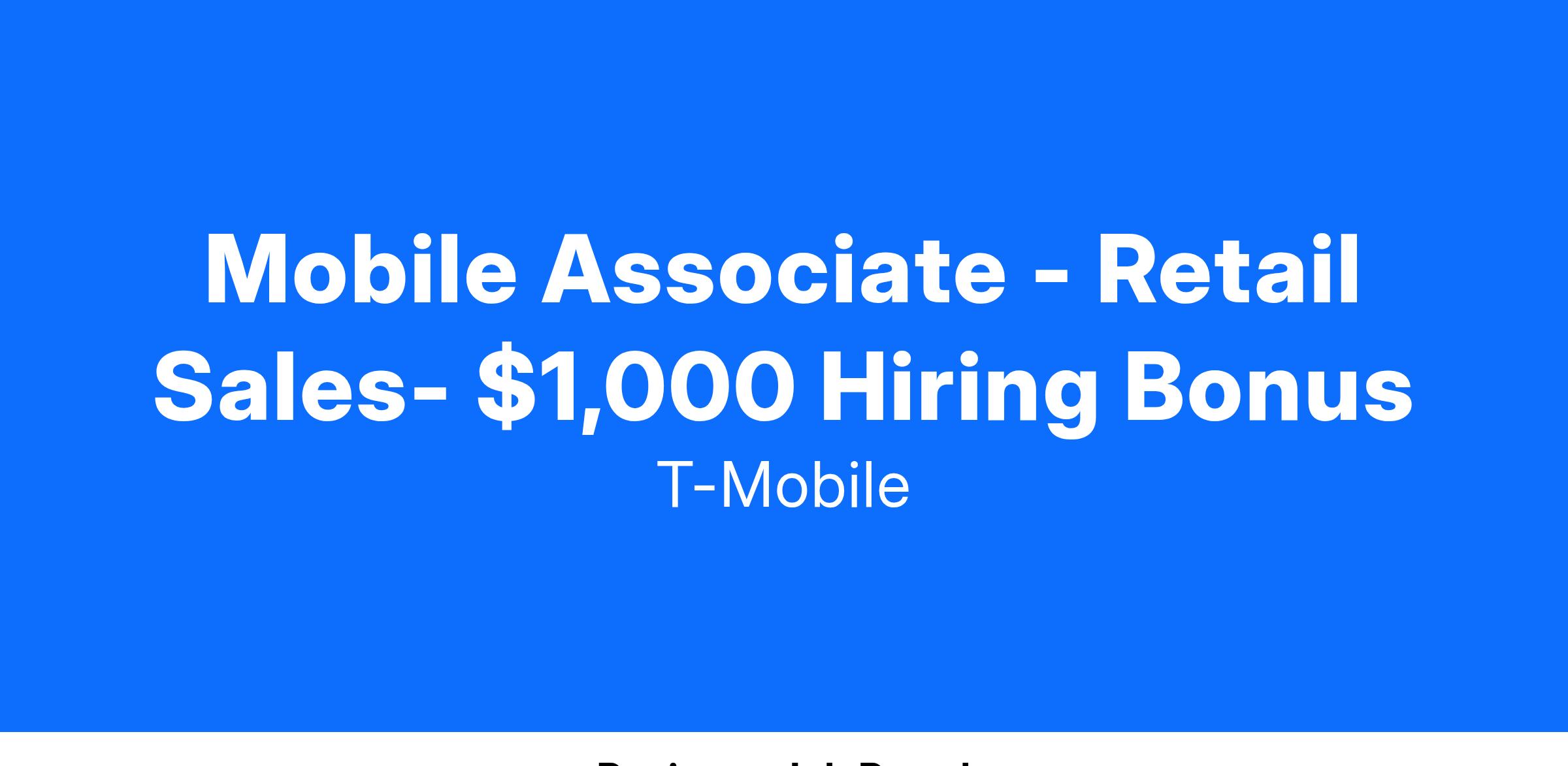 Mobile Associates (MA) work as a member of a Retail Team of Experts to bring the T-Mobile brand to life. They're brand ambassadors who build energy and excitement around our products and services. They are passionate about the connected world and thrive in a fast-paced environment, where technology innovations, customer needs, and the Retail experience are continuously evolving. They immerse themselves in significant connections with our customers, and their ability to build new and deepen existing relationships is unmatched across the wireless industry.Within the first 90 days working at T-Mobile, Mobile Associates receive on-the-job training and are eligible for incentive pay while completing training milestones. Once completed, Mobile Associates promote to the Mobile Expert role and become eligible for an annualized incentive target of $18,000/year. Actual incentives vary based on performance and full-time status. All employees at T-Mobile, are guaranteed to earn $20/hour inclusive of base pay and incentives. And since we are ALL owners, EVERY employee at T-Mobile is eligible for an Annual Stock Grant.