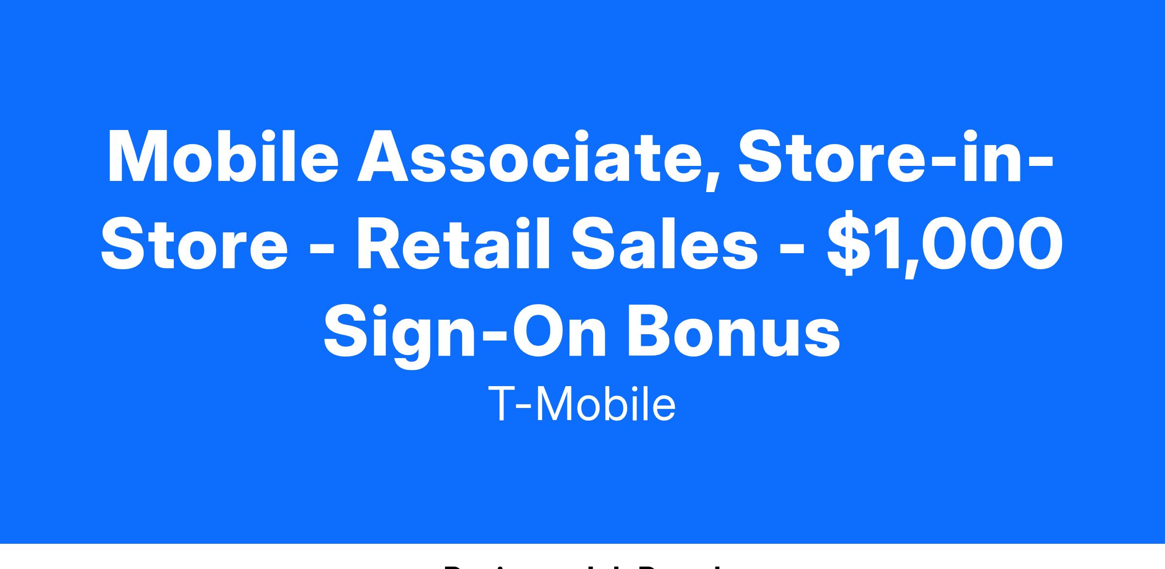Mobile Associates, Store-in-Store are an integral part of the Retail Team responsible for bringing the T-Mobile brand to life within National Sales partner locations, where active customer engagement is crucial for success. They're ambassadors who create energy and excitement around our products and services. They are obsessed with the connected world and thrive in a high-traffic environment, where technology innovations, customer needs and the Retail experience are continuously evolving. Mobile Associates excel at building and deepening relationships with customers through meaningful interactions. They are skilled at identifying customer needs and are passionate about educating, demonstrating, and recommending solutions. Mobile Associate SiS, exceed their performance targets Doing it the Right Way, by excelling in sales, providing exceptional customer experiences, and meeting quality of sale metrics.