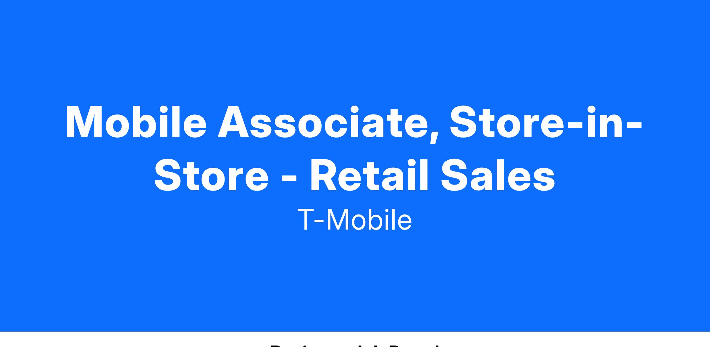 Mobile Associates, Store-in-Store are an integral part of the Retail Team responsible for bringing the T-Mobile brand to life within National Sales partner locations, where active customer engagement is crucial for success. They're ambassadors who create energy and excitement around our products and services. They are obsessed with the connected world and thrive in a high-traffic environment, where technology innovations, customer needs and the Retail experience are continuously evolving. Mobile Associates excel at building and deepening relationships with customers through meaningful interactions. They are skilled at identifying customer needs and are passionate about educating, demonstrating, and recommending solutions. Mobile Associate SiS, exceed their performance targets Doing it the Right Way, by excelling in sales, providing exceptional customer experiences, and meeting quality of sale metrics.