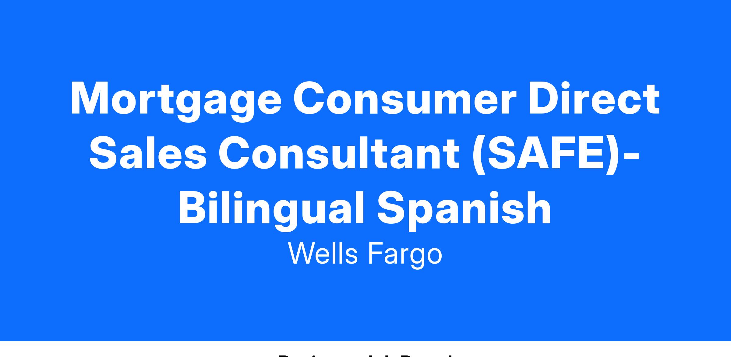 Wells Fargo is seeking a Mortgage Consumer Direct Sales Consultant to support our Consumer Direct Team. Our Consumer Direct team builds strong relationships with consumers and referral partners to help our customers reach their personal and financial goals through homeownership. Mortgage Consumer Direct Sales Consultants provide answers and guidance regarding mortgage-related products and services for clients, customers, and potential customers. Our Mortgage Consumer Direct Sales Consultants thrive on customer interaction and never miss an opportunity to enhance and deepen the customer's relationship. They are skilled communicators, organized, have strong integrity, are highly motivated, and strive to reach and meet goals. Learn more about the career areas and lines of business at wellsfargojobs.com.
