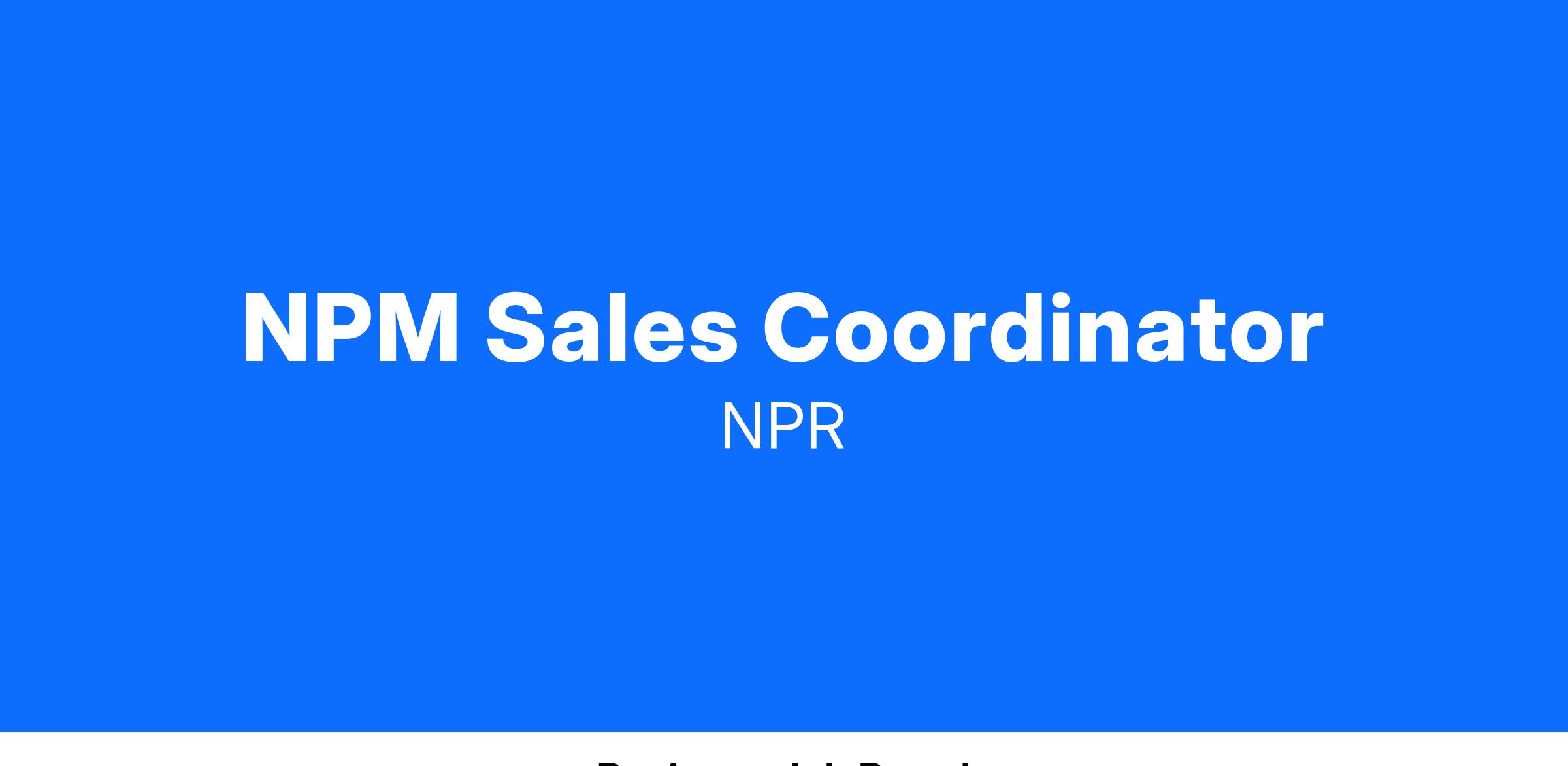 National Public Media is looking for an experienced sales coordinator to join our New York NPR sales office. The sales team represents NPR’s radio, podcast, digital and events platforms. The ideal candidate has experience working in a fast-paced media sales or advertising agency environment, is curious about the media industry, detail-oriented, able to multi-task and has a proven ability to thrive under pressure.