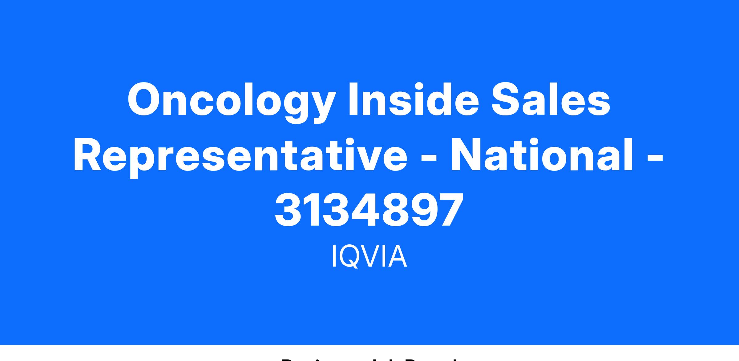 IQVIA offers a wide array of benefits to support our employees and their families. Best of all, we offer a comprehensive benefit plan that is effective day one! This includes, but is not limited to, Health, Dental, Vision, 401k, Tuition Assistance, and Discretionary Time Off. Ask your Recruiter for additional information.