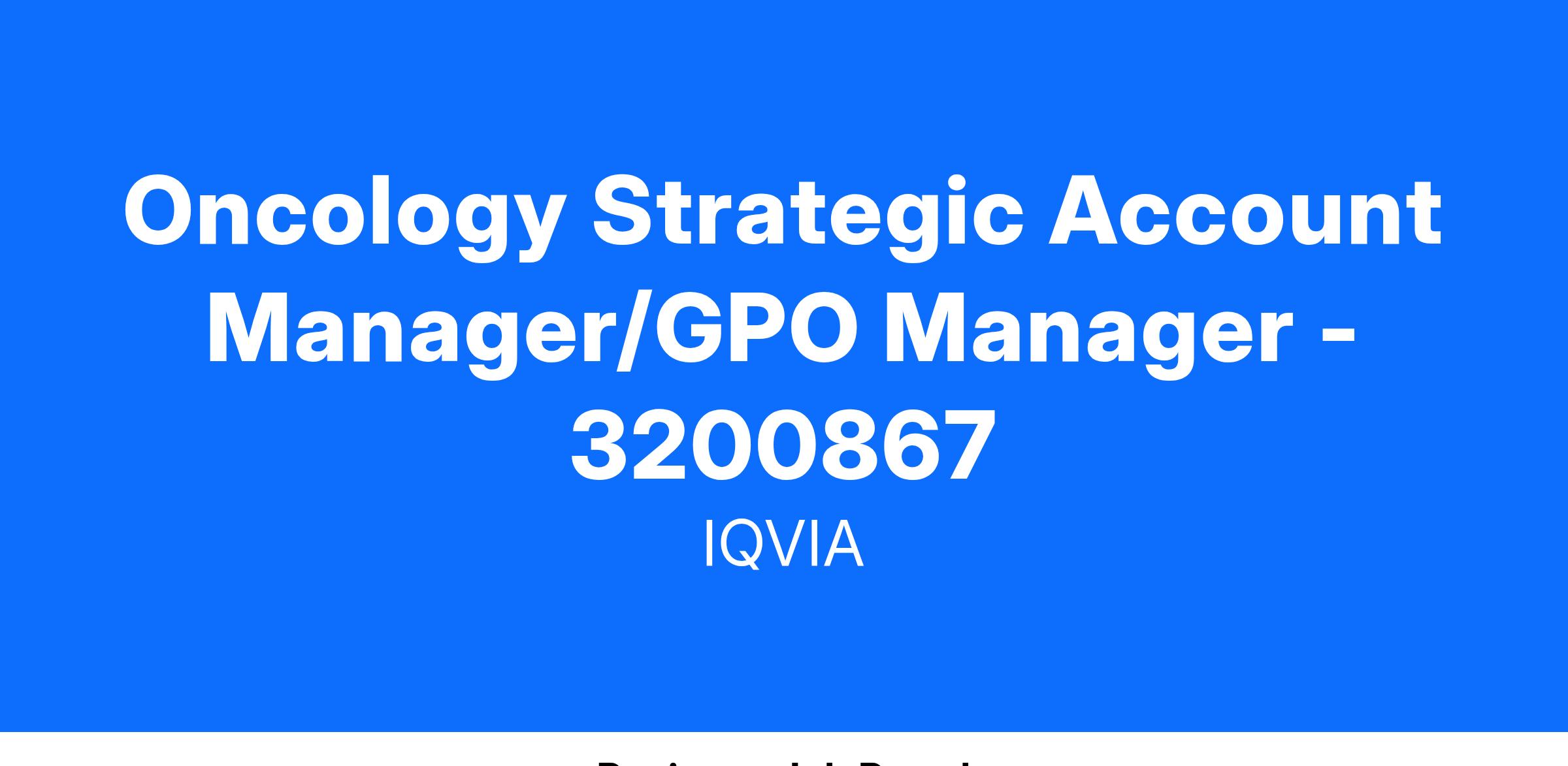 We are excited to announce that at this time we are looking for a Strategic Account Manager/GPO Manager to join our team of over 10,000 global field representatives in several regions making over 20 million product details annually for our pharmaceutical and biotech clients. In this role you will be supporting a pharmaceutical company recognized worldwide for their innovative medicines they provide to patients, physicians and healthcare organizations.