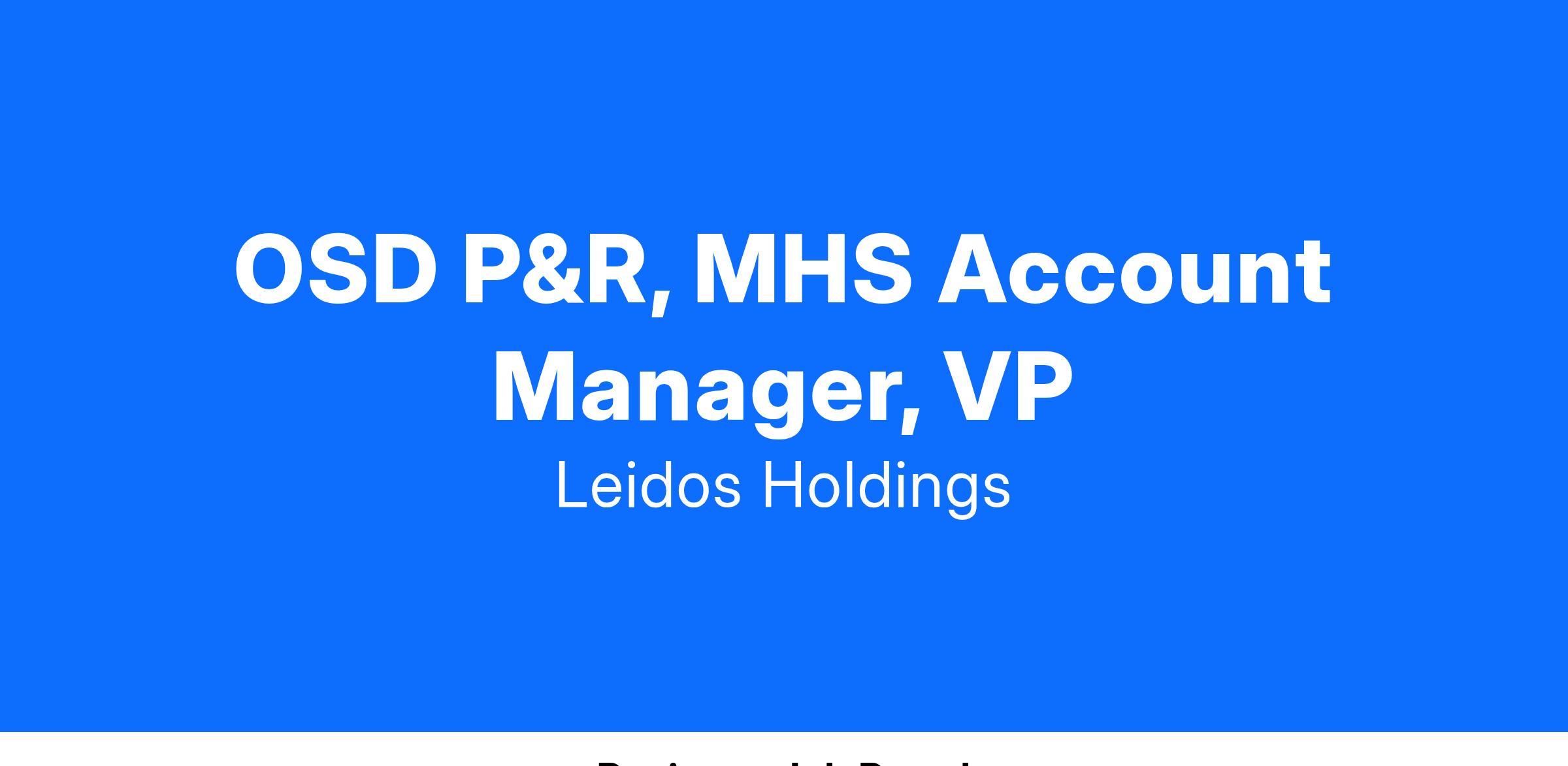 Leidos has an exciting career opportunity for a VP, Strategic Office of the Under Secretary of Defense for Personnel & Readiness (OSD P&R) - Military Health System (MHS) Account Manager to strengthen and advance relationships with the Personnel and Readiness organization, to include the Defense Health Agency (DHA), Service Medical commands, Defense Manpower Data Center (DMDC), and the Military Community and Family Policy (MC&FP) office. The Account Manager must have extensive career experience and recognized credentials supporting OSD and MHS missions and operations – to include their cooperative activities with the VA - along with a sustained network and strong relationship building skills. The candidate must be familiar with the customer leadership and be able to exchange information and ideas with influencers and decision makers supporting strategy, plans and programs. In doing the above, the position requires understanding the mission, internal and external pressures and to engage in shaping the environment for growth.
