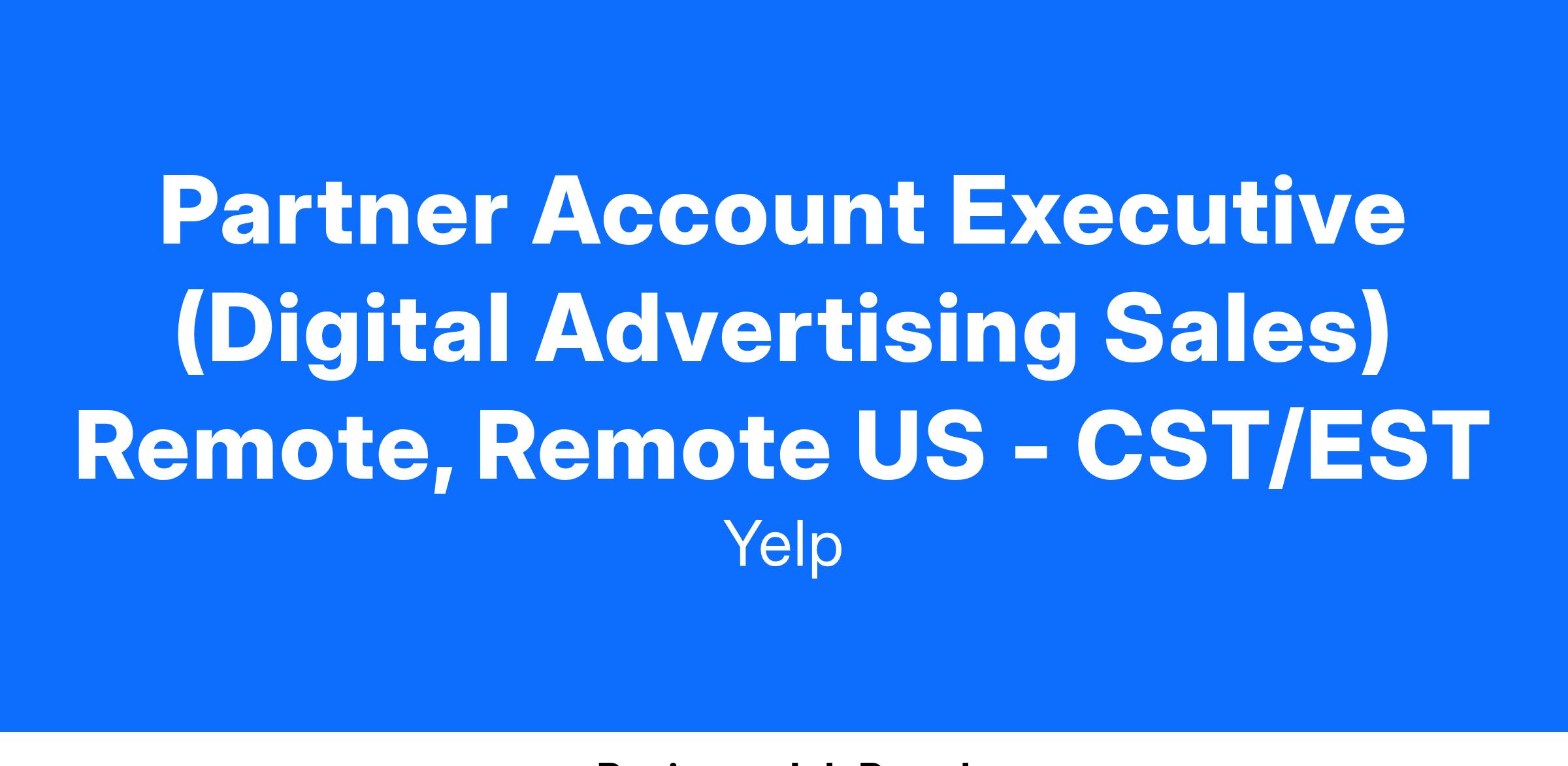 Summary We are seeking a proficient sales professional who can showcase a track record of accomplishments within a vibrant, swiftly growing company. This person will be a valuable asset to our fast-paced, high growth division concentrating on Partner Sales at Yelp. The main duty of the Partner Account Executive is to secure new business for Yelp by fostering connections with digital marketing agencies that serve SMBs. These agencies collaborate with Yelp to both resell and purchase Yelp’s Local products. Our collaborative sales culture is where your individual contributions make a big impact on the business of our clients. You’ll work with teammates who celebrate your wins (both big and small) every step of the way. Yelp is where you can be part of an empowering mission and build a rewarding career that grows with you. The perfect candidate for this role will possess the capability to rapidly grasp the business and exhibit the worth of Yelp’s product offerings and partnership program. This role calls for an individual who is exceptionally motivated and enthusiastic, with the skill to cultivate strategic relationships and create fresh business opportunities. The preferred candidate approaches sales in a consultative manner – comprehending agency models and identifying the needs and decision criteria of potential clients. Most importantly, meeting revenue targets will fall under your responsibility. We’d love to have you apply, even if you don’t feel you meet every single requirement in this posting. At Yelp, we’re looking for great people, not just those who simply check off all the boxes. This is a full-time remote role based in the East/ Midwest Coast of the United States. What you'll do: Foster a collaborative business relationship between Yelp and SMB digital marketing agencies (primarily local) and their advertisers. Hold a Bachelor’s Degree OR 3+ years equivalent experience in Digital Advertising Sales Craft consultative sales presentations to illustrate how Yelp’s advertising products can be utilized to connect with consumers. Lead training sessions to assist the agency in becoming more adept at building and executing effective campaigns. Consistently surpass quarterly and annual revenue targets assigned by management while contributing to overall team targets. Cultivate and manage partner relationships to ensure surpassing of assigned goals. Identify new agency partnerships which align with Yelp’s partner compliance as needed to meet growth expectations. Chart out agency structure and identify key decision makers, budget owners, and the agencies' decision-making process. Provide accurate weekly forecasts and sales plans. Engage with agencies continually to nurture relationships, validate advertisers' needs, and maintain Yelp’s partnership prominence. Collaborate harmoniously with cross-functional teams to drive revenue growth with new customers. Arrive at work each day with a positive attitude and readiness to succeed. #LI-REMOTE #LI-TU1 What it takes to succeed: Have a proven achievement in meeting sales goals in a prior role Have experience collaborating with marketers at executive levels Have familiarity with pay per click advertising an advantage Have superb communication and presentation abilities Are adaptable, open to startup environments, and capable of thriving within an ever-changing, swift-paced workplace Display self-motivation, foster teamwork, and exhibit a determined commitment to surpassing targets Are skilled in Powerpoint, Excel, and Salesforce What you'll get: Effective your first day: Full medical, vision, and dental Mental health support and services via Modern Health 15 days PTO (accrual begins on date of hire and increases with 2+ years of tenure thereafter), 12 paid holidays, plus one floating holiday Up to 14 weeks of parental leave Monthly wellness subsidy Flexible spending account 401(k) retirement savings plan Employee stock purchase plan Professional development reimbursement Work from home reimbursement Base salary is $80,000 plus performance based incentives (uncapped commission) For more information about US benefits at Yelp, please check out this link Closing At Yelp, we believe that diversity is an expression of all the unique characteristics that make us human: race, age, sexual orientation, gender identity, religion, disability, and education — and those are just a few. We recognize that diverse backgrounds and perspectives strengthen our teams and our product. The foundation of our diversity efforts are closely tied to our core values, which include “Playing Well With Others” and “Authenticity.” We’re proud to be an equal opportunity employer and consider qualified applicants without regard to race, color, religion, sex, national origin, ancestry, age, genetic information, sexual orientation, gender identity, marital or family status, veteran status, medical condition or disability. Actual salary offered may vary based on multiple factors, including but not limited to, an individual's location and experience. We will consider for employment qualified candidates with arrest and conviction records, consistent with applicable law (including, for example, the San Francisco Fair Chance Ordinance for roles based in San Francisco, the Los Angeles County Fair Chance Ordinance for roles based in the unincorporated areas of Los Angeles County, and the California Fair Chance Act for roles based in California). We are committed to providing reasonable accommodations for individuals with disabilities in our job application process. If you need assistance or an accommodation due to a disability, you may contact us at accommodations-recruiting@yelp.com or 415-969-8488. Note: Yelp does not accept agency resumes. Please do not forward resumes to any recruiting alias or employee. Yelp is not responsible for any fees related to unsolicited resumes. US Recruiting and Applicant Privacy Notice #LI-Remote