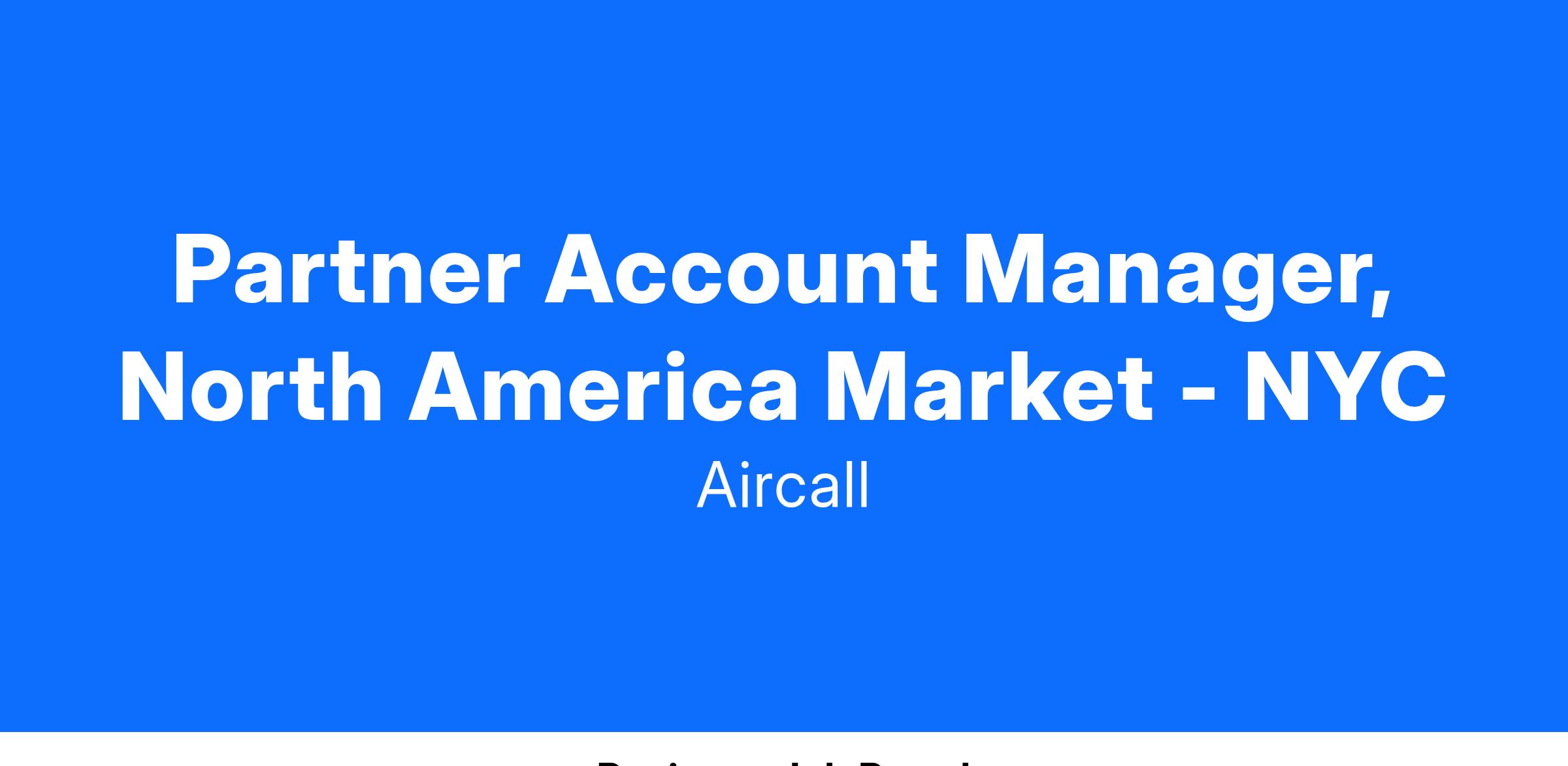 Partnership Development: Drive engagement, enablement, pipeline, and revenue for one of Aircall’s key markets. Actively manage a portion of the partnership portfolio, contributing directly to partnership targets and success. Build and cultivate lasting, meaningful relationships with our partners’ teams to increase awareness of the Aircall value proposition.
