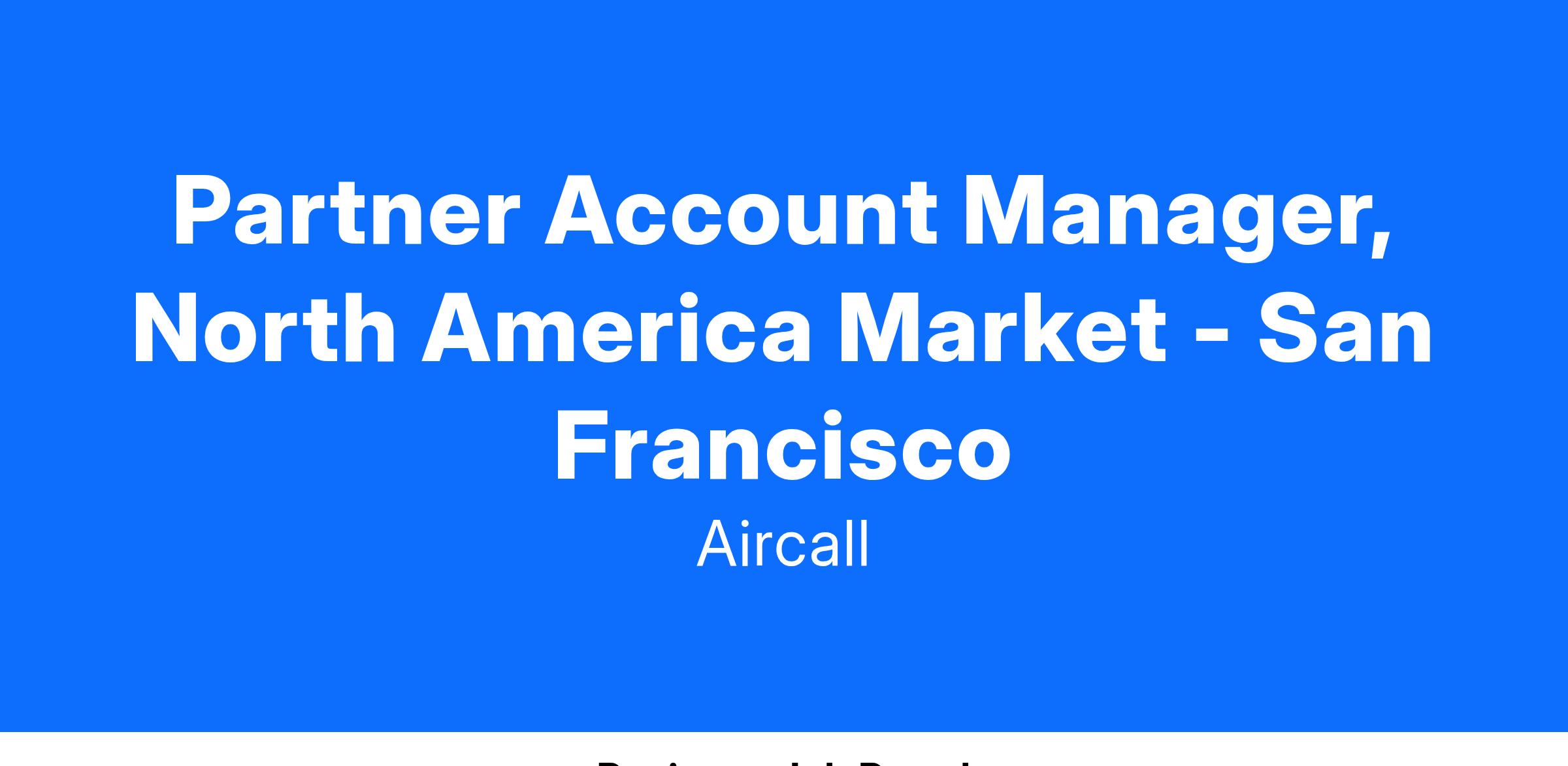 Partnership Development: Drive engagement, enablement, pipeline, and revenue for one of Aircall’s key markets. Actively manage a portion of the partnership portfolio, contributing directly to partnership targets and success. Build and cultivate lasting, meaningful relationships with our partners’ teams to increase awareness of the Aircall value proposition.
