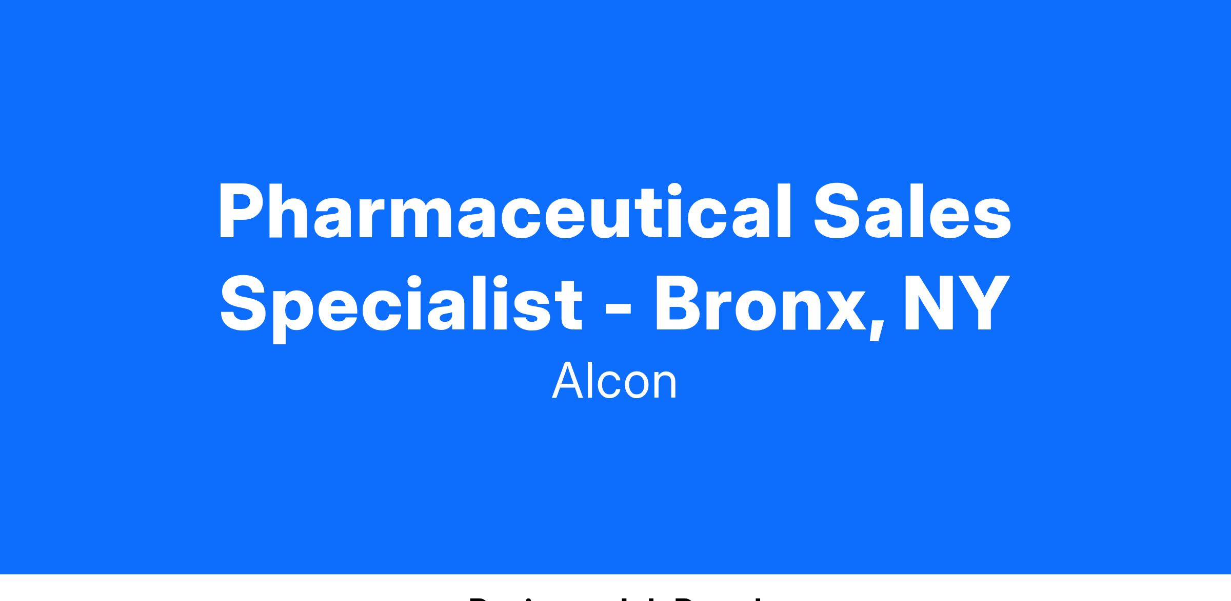 We foster an inclusive culture and are looking for diverse, talented people to join Alcon. As a Sr. Associate, Pharmaceutical Sales one will be responsible for covering a large territory and will focus on a defined target list of physicians/practitioners within the territory. One will also assure the needs of all partners are met within compliance guidelines while developing relationships and maintaining an active presence in the pharmaceutical community or associated organizations throughout the territory area of Bronx, NY.