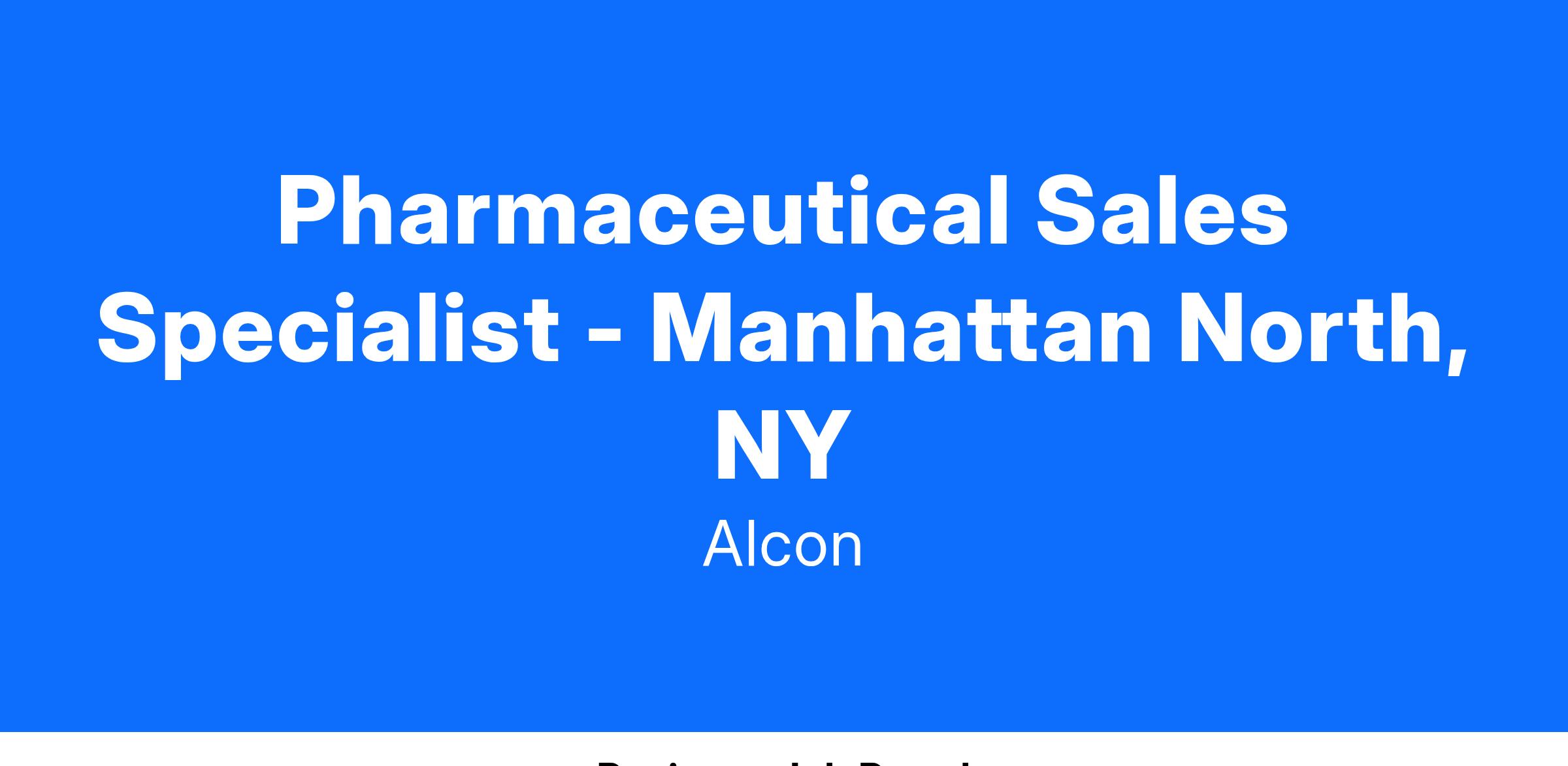 We foster an inclusive culture and are looking for diverse, talented people to join Alcon. As a Sr. Associate, Pharmaceutical Sales one will be responsible for covering a large territory and will focus on a defined target list of physicians/practitioners within the territory. One will also assure the needs of all partners are met within compliance guidelines while developing relationships and maintaining an active presence in the pharmaceutical community or associated organizations throughout the territory area of Manhattan North, NY.