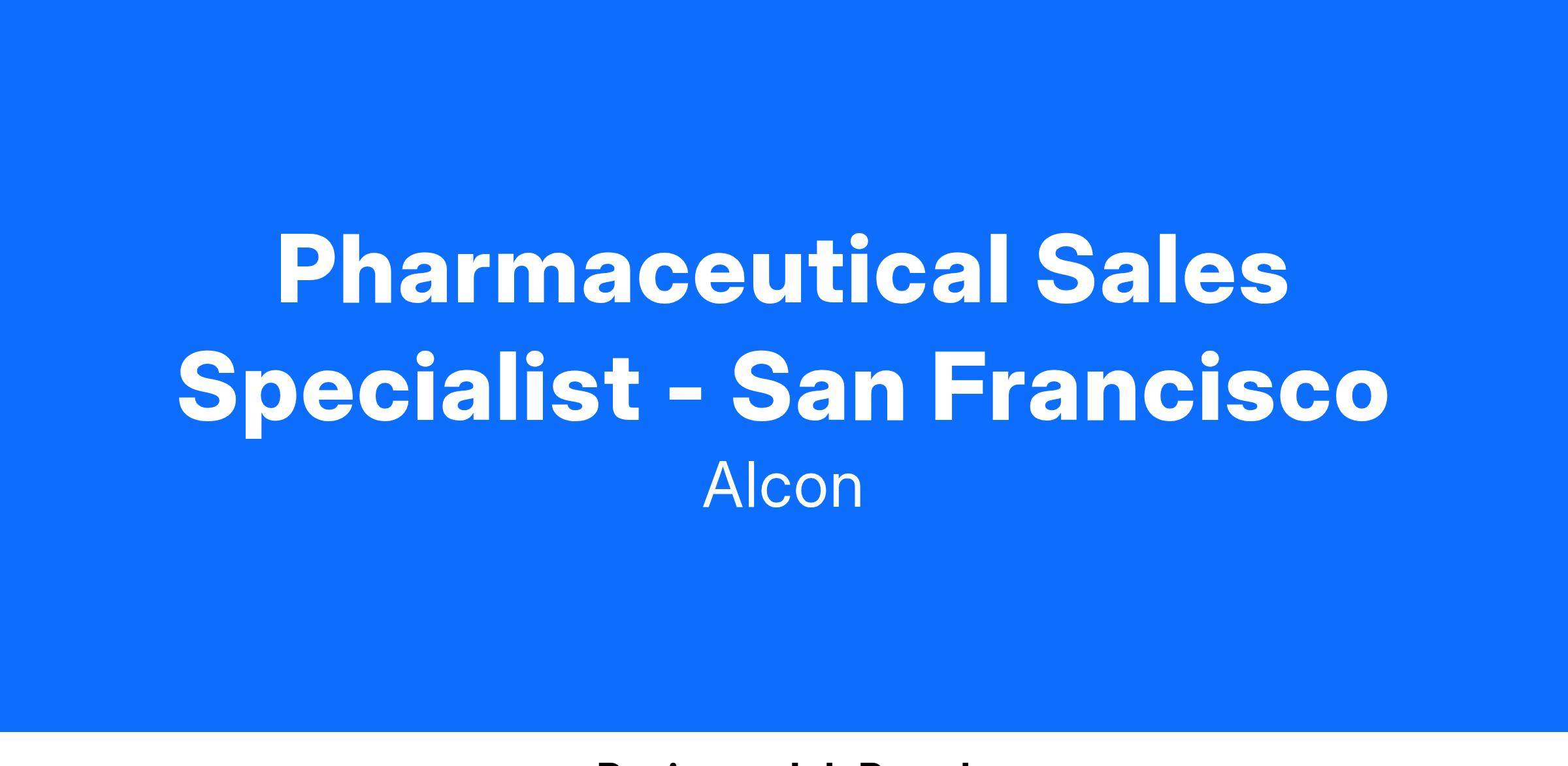We foster an inclusive culture and are looking for diverse, talented people to join Alcon. As a Sr. Associate, Pharmaceutical Sales one will be responsible for covering a large territory and will focus on a defined target list of physicians/practitioners within the territory. One will also assure the needs of all partners are met within compliance guidelines while developing relationships and maintaining an active presence in the pharmaceutical community or associated organizations throughout the territory area of San Francisco.