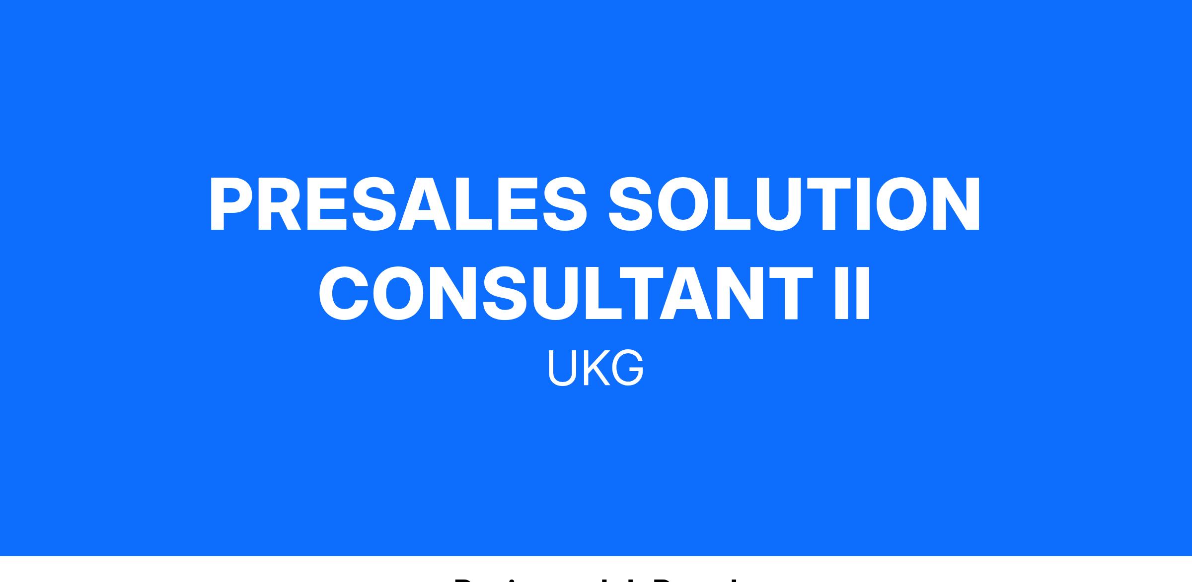 UKG is looking for a Presales Solution Consultant to join our family. If you are talented, energetic, and committed to delivering quality demonstrations of our UKG HCM and WFM solutions, this is the perfect place to work and grow professionally.
