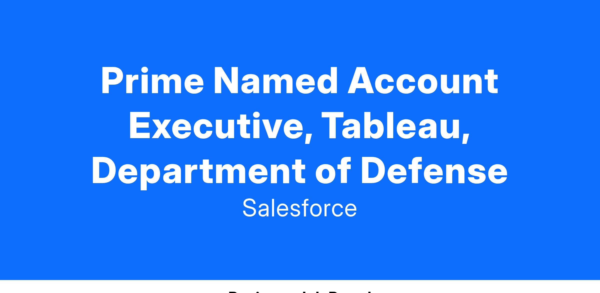 Our Prime Named Enterprise Account Executives engage with existing customers and new leads to sell the entire Tableau platform. They build positive, trusted relationships with both key team members and c-suite decision makers within their patch, and become naturals at helping customers realize value from their Salesforce investments. You will drive the analytics discussion and identify use cases within your accounts.