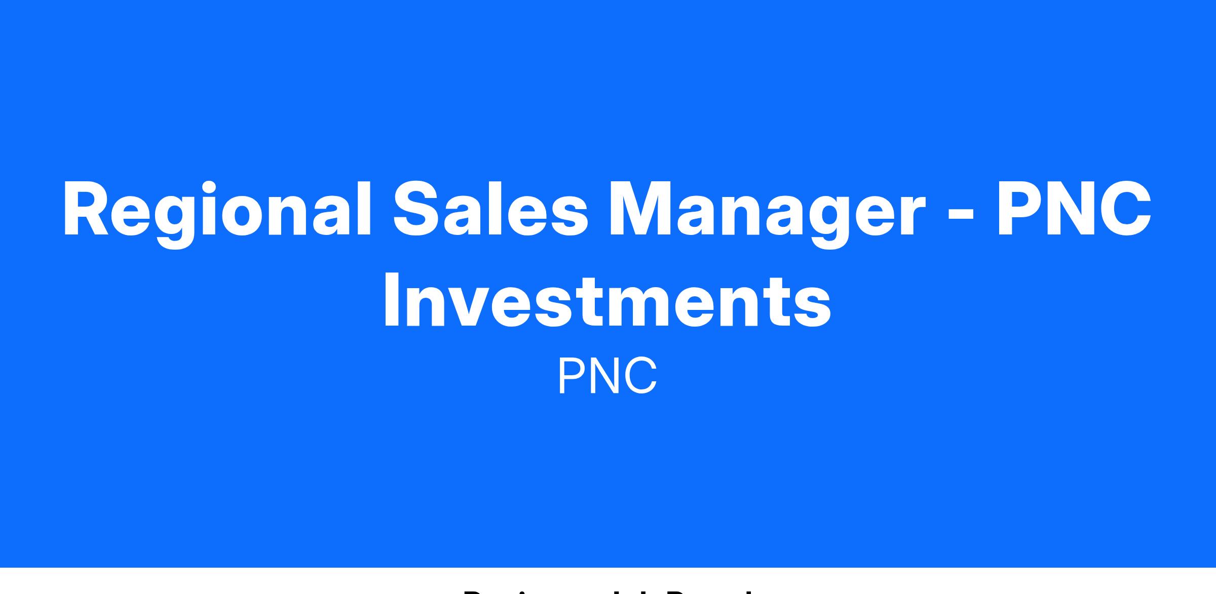 As a Regional Sales Manager (RSM) leading a team of Senior Financial Advisors, you may be located throughout the PNC Investments Footprint. RSMs support and drive a sales team, who manage an assigned book of business, on an advice and planning strategy focused on helping clients meet their savings, investing, and retirement goals. Our team of financial planning experts guide our clients in creating personalized solutions. Our comprehensive, holistic and strategic approach will harmoniously keep all parties on the same side of the table. At PNC Investments, we are passionate about our values and helping our advisors build their future.