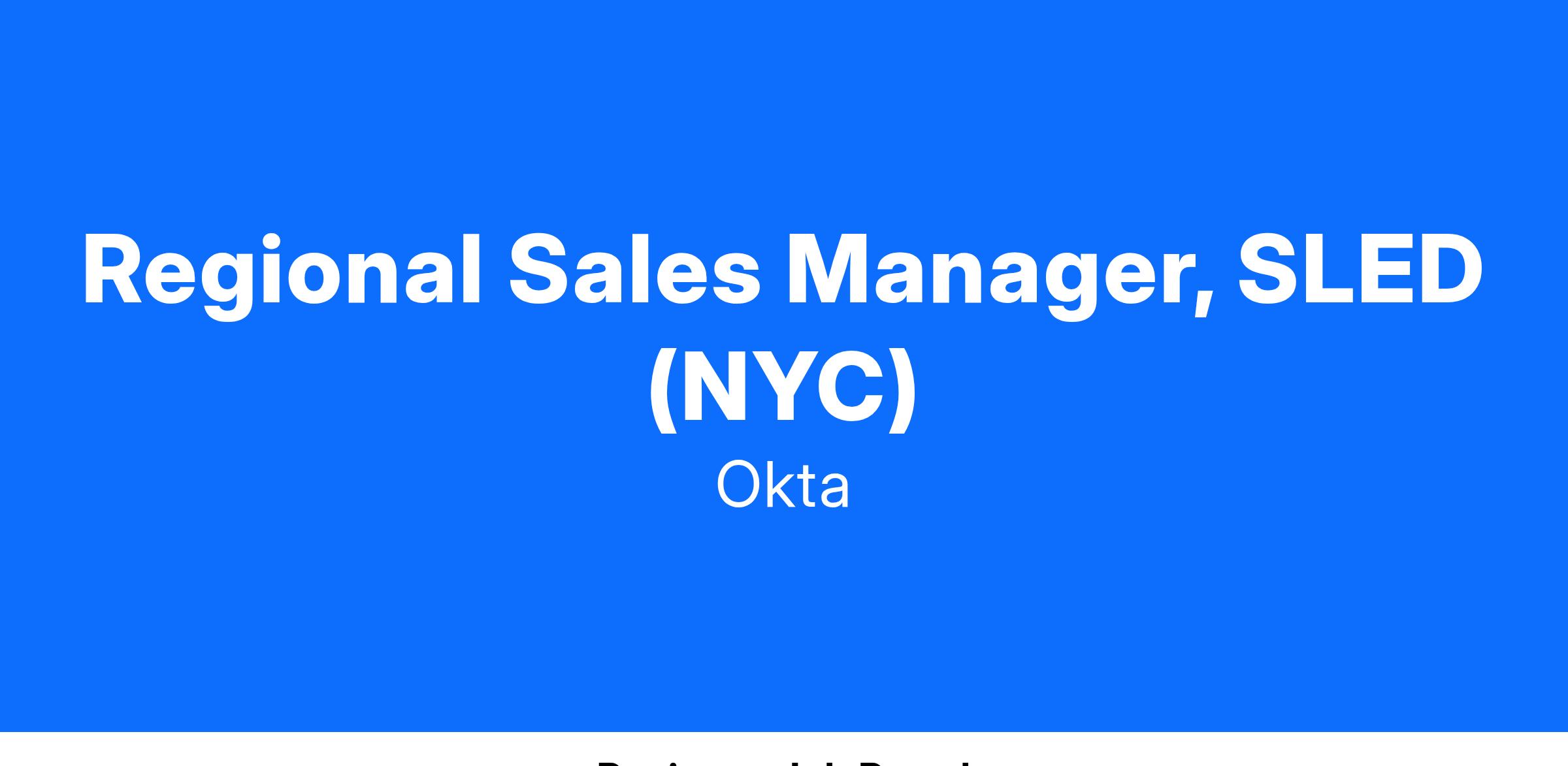 We are seeking a passionate, results oriented, sales professional to drive revenue growth calling on SLED accounts.  Our Regional Sales Manager's are individual contributors who play a vital role in driving a significant share of revenue for Okta. We provide our reps with an environment in which they can make valuable contributions from day one while also building opportunities for learning and growth.