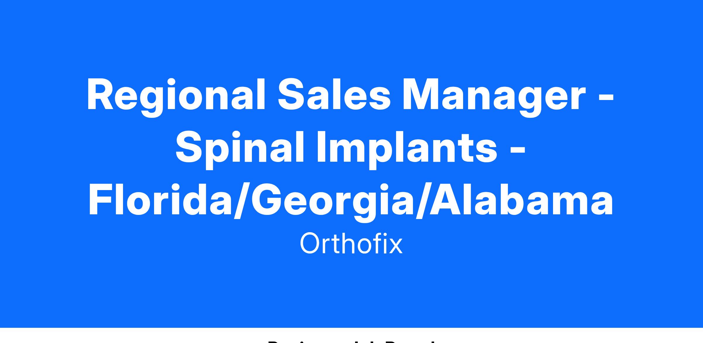 This position manages and leads the Spinal Implants business activities in the Florida/Georgia/Alabama territory, under the direction of the Spinal Implants Regional Vice President (SIRVP). As directed by the SFRVP, the Spinal Implants RM oversees the performance of multiple aspects within the territory including: distributor sales performance, sales force training, hospital and GPO relationships, pricing and promotions, surgeon product training, surgeon relationships, and distribution optimization. Position also directly promotes the on-label use of the Spine Fixation portfolio to physicians and healthcare providers in a clinic, office, and OR setting. The individual must demonstrate consultative selling and communication skills, technical expertise, and work well in a team environment in order to transition the surgeon to use our Spine Fixation platform for the benefit of their patients. This person must demonstrate a strong commitment to mastering in-depth spine, anatomy, physiology and clinical applications to assist physician preference for treatment.