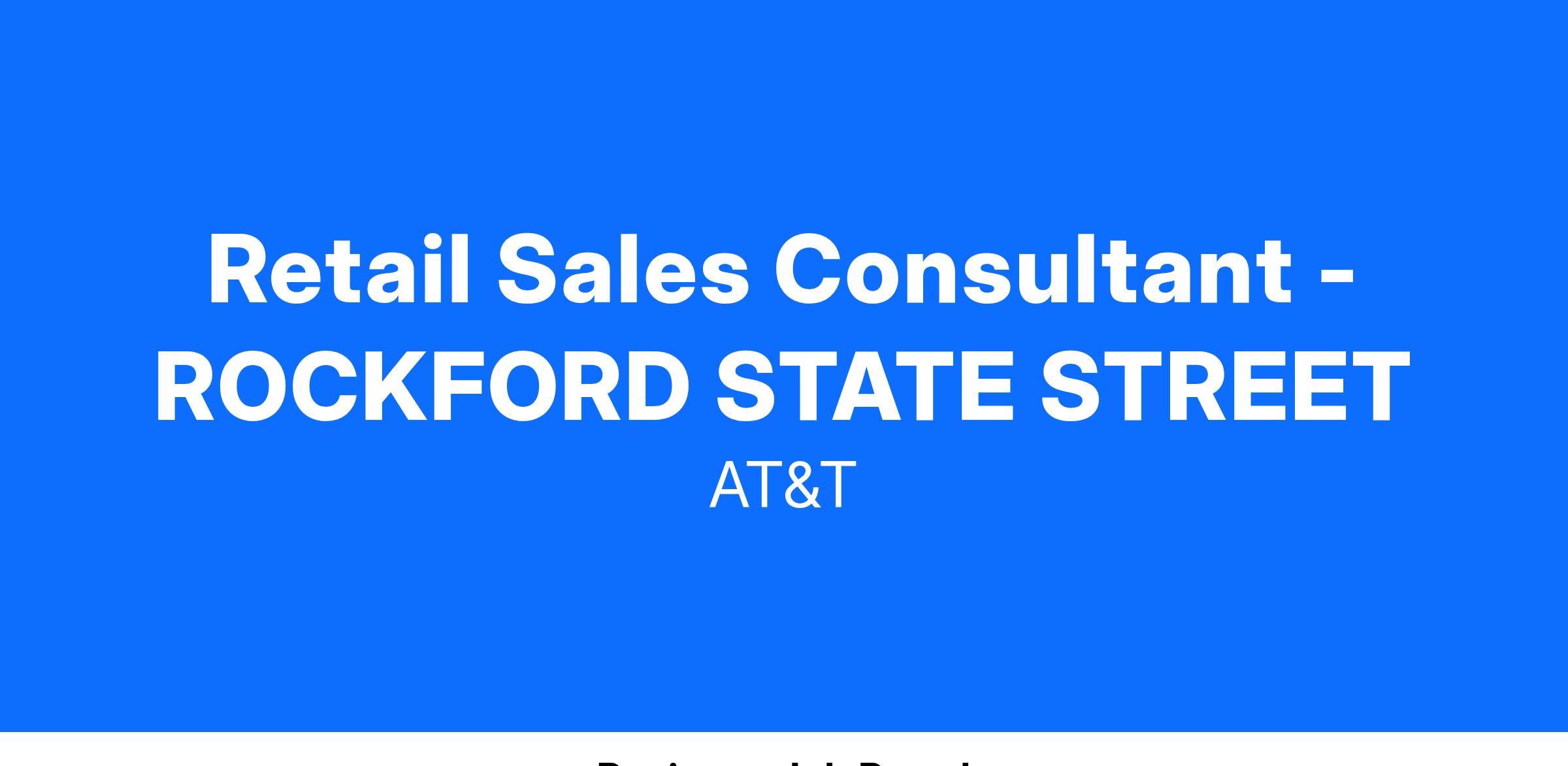 JobTitle : Retail Sales Consultant - ROCKFORD STATE STREET JOBKEYJOBCODE : 16000025 Wage Scale/Schedule/ Class/Level : Y6 Time on Assignment (TOA) : Residency : Time in Title (TNT) : Job Family : CS Union Affiliation : Mobility Orange (Districts 1, 2-13, 4, 7, 9) Region : MBLT GENERAL DUTIES :The functions listed below are representative of duties performed by this job title. Duties generally include but are not limited to the following:
