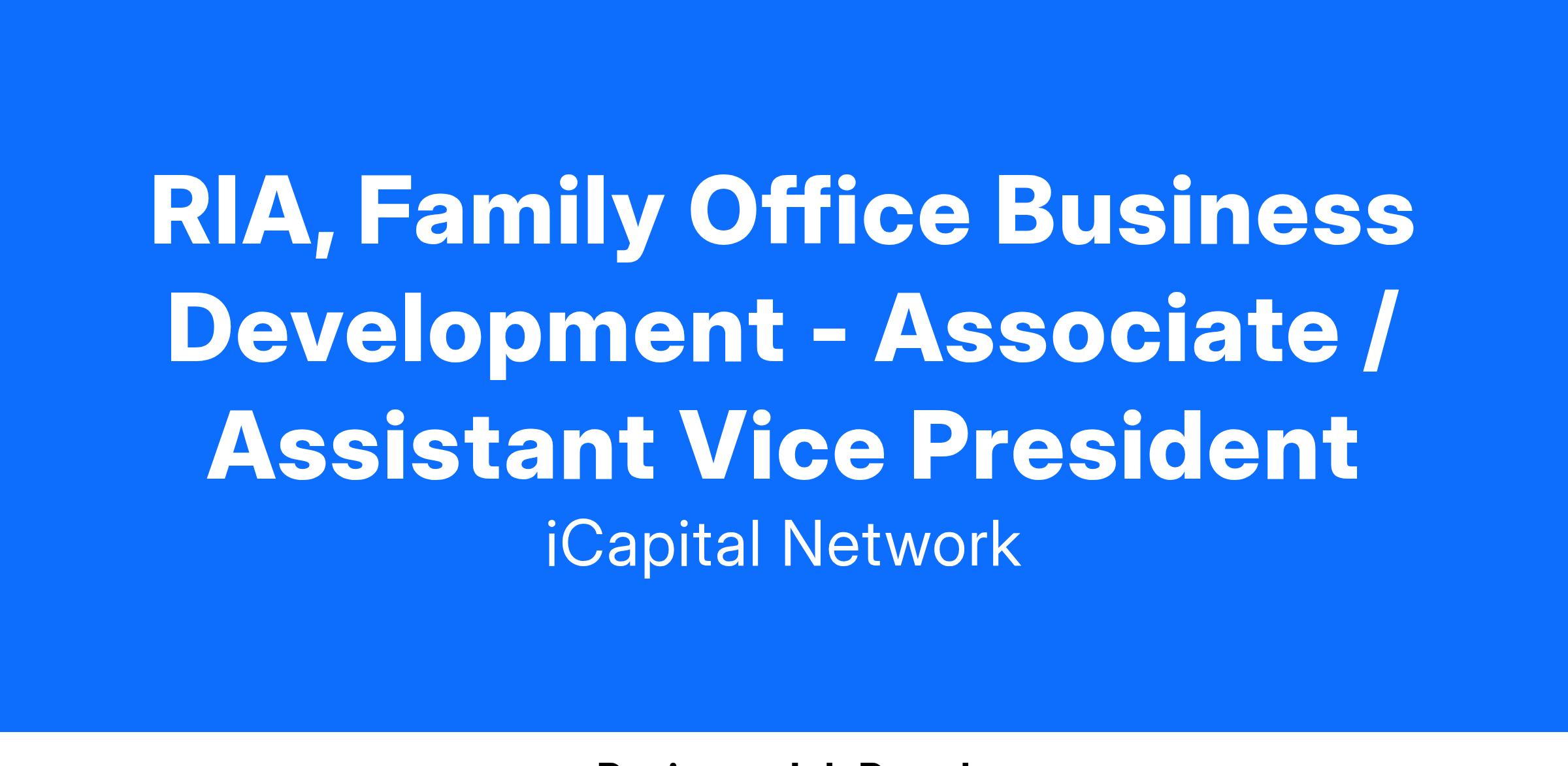 iCapital is seeking a highly motivated, outgoing, and experienced Business Development professional to join the Data Solutions team expanding iCapital’s enterprise presence in the US wealth channel. This team develops relationships with iCapital’s largest clients and prospects, within the RIA and Family Office channel. The Data Solutions team offers financial reporting services for the Family Office and Wealth Management industry.
