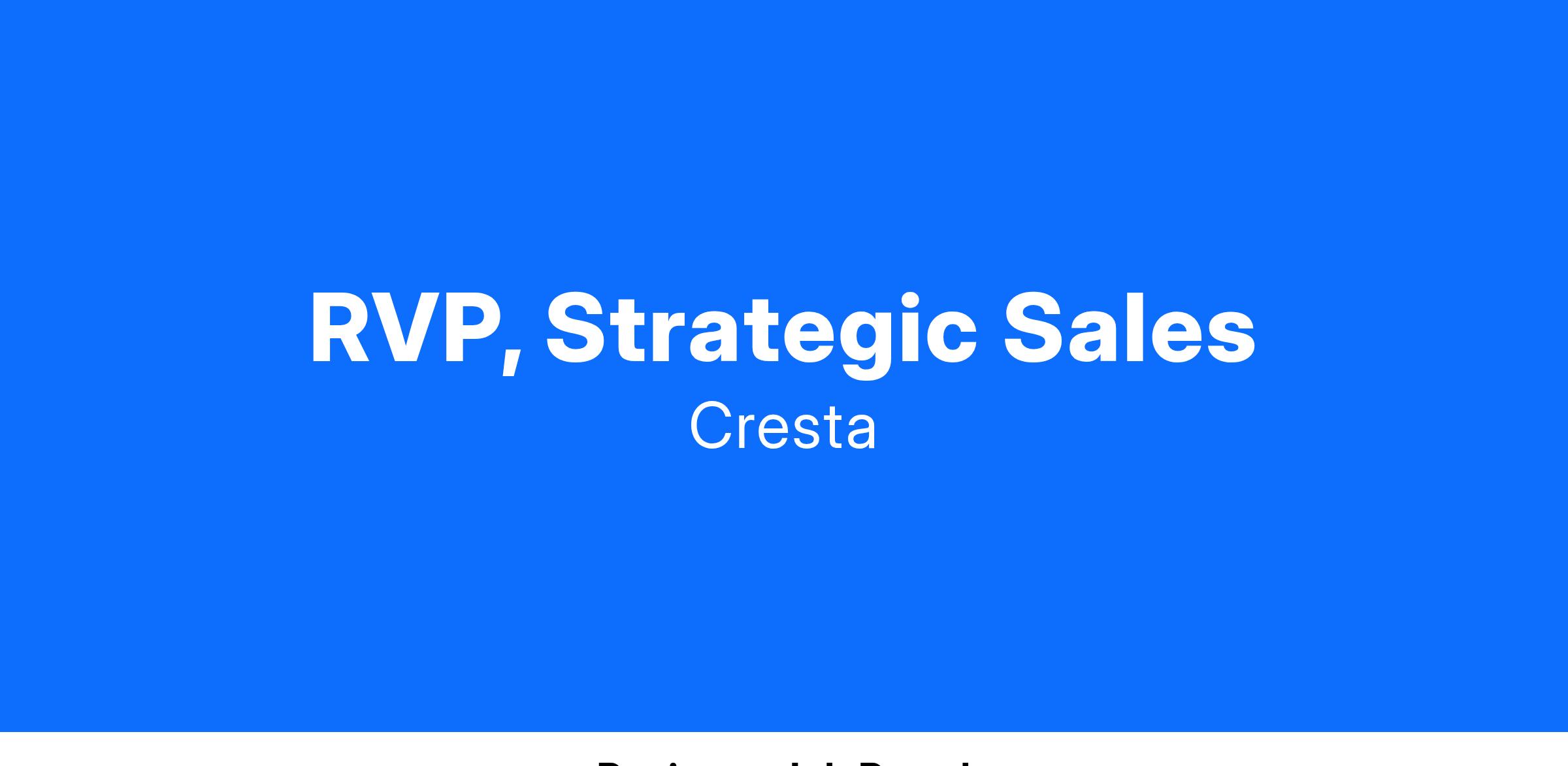 Lead a team of Strategic Sales Directors who drive new enterprise business and expand key accounts with Cresta. The RVP will provide strategic direction and coaching for the team, drive team performance aligned with business outcomes, manage operational execution, and partner closely with key stakeholders and cross-functional teams. You are accountable for ensuring the region archives new business and expansion goals for Cresta’s Enterprise Accounts. This role will report to the respective Area Vice President. This is a full-time remote position in the US.