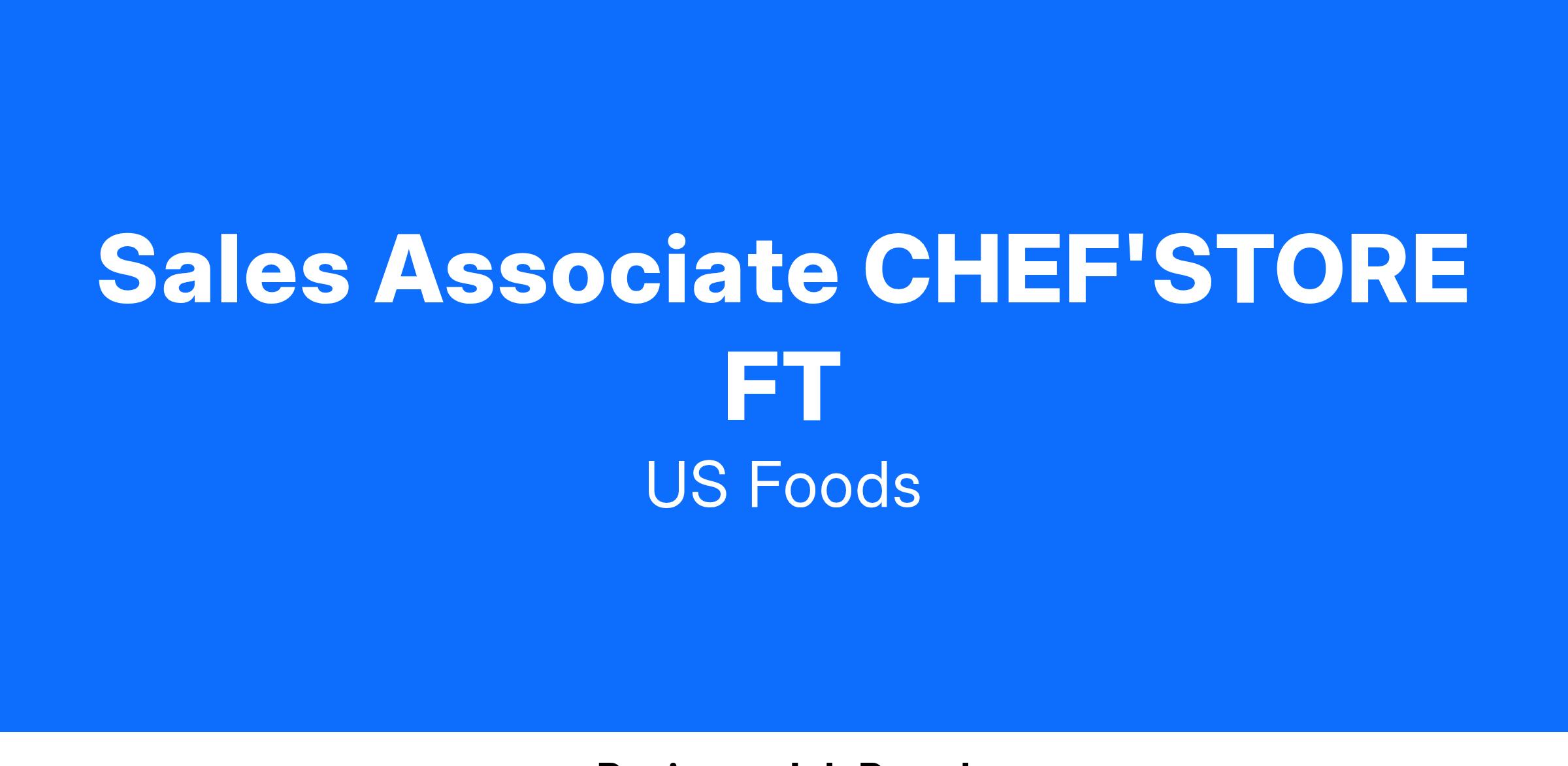 The CHEF’STORE Sales Associate helps maintain an atmosphere of superior customer service, promoting the US Foods strategy: Great Food, Made Easy. We rely on our team to promote and exemplify the US Foods Cultural Beliefs: Deliver Excellence, Stop Waste, WIN Together, Speak Up and You Matter. As a key member of our team, you will fill a variety of roles, including Cashier, Stocker, and Customer Courtesy, and must be passionate about service and model this behavior in all aspects of job performance.QUALITY AND DEDICATION BEGINS WITH OUR TEAM, SO JOIN CHEF’STORE TODAY! We help YOU make it!