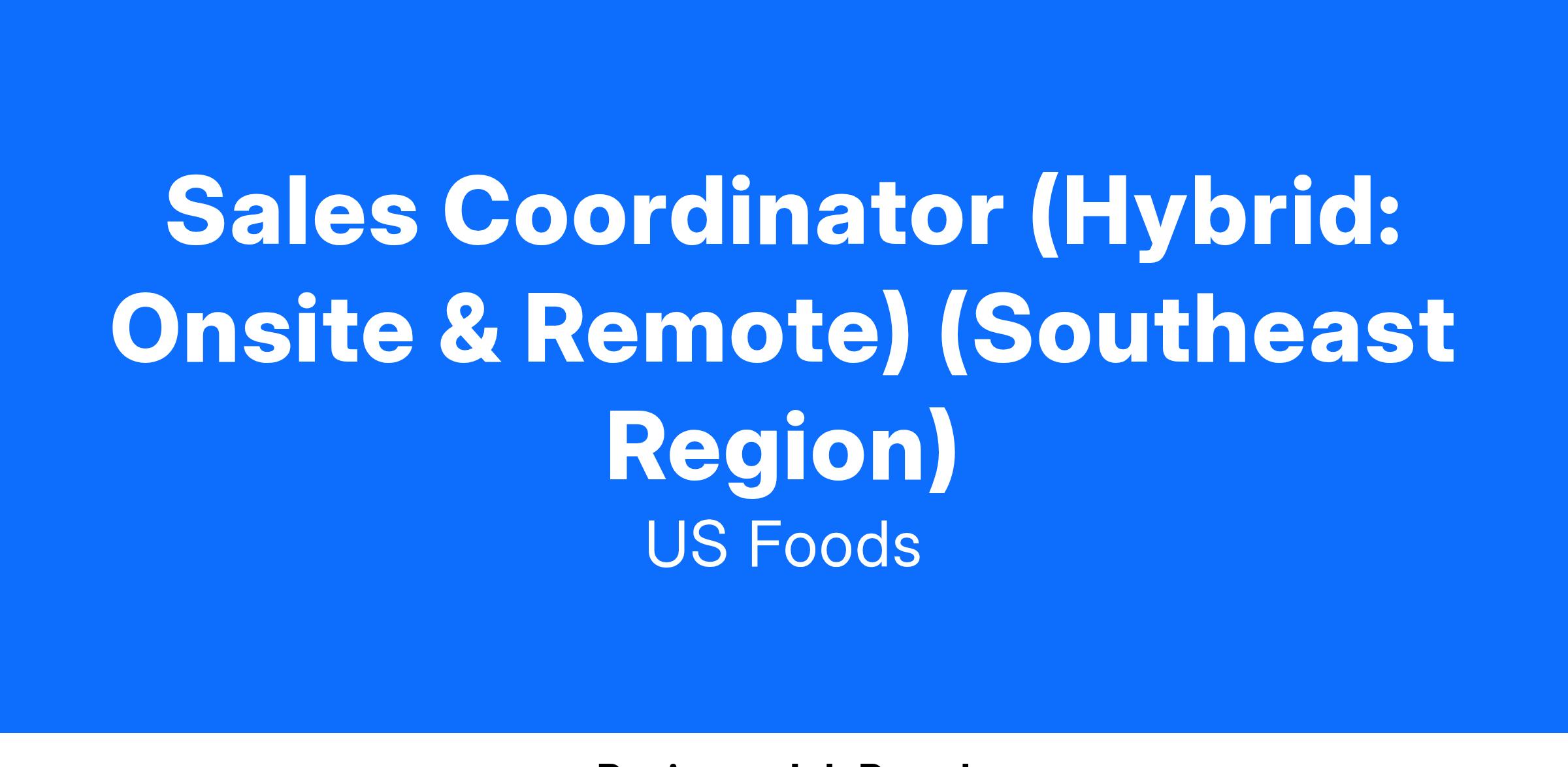 This position has been segmented as hybrid meaning the work is a combination of approximately 90 percent remote/virtual and 10 percent onsite at distribution center offices located anywhere in the Southeast Region of the United States as follows: Hurricane WV, Salem VA, Raleigh NC, Charlotte NC, Fort Mill, SC, Lexington SC, Port Orange FL, Boca Rotan FL, Tampa FL, Marrero, LA, Flowood MS, Montgomery, AL, Little Rock, AR, Memphis, TN, Alcoa, TN, Norcross, GA, Fairburn, GA, within a 50 mile distance to the listed Distribution Offices.Ready to build a career with a company that’s leading the foodservice industry?