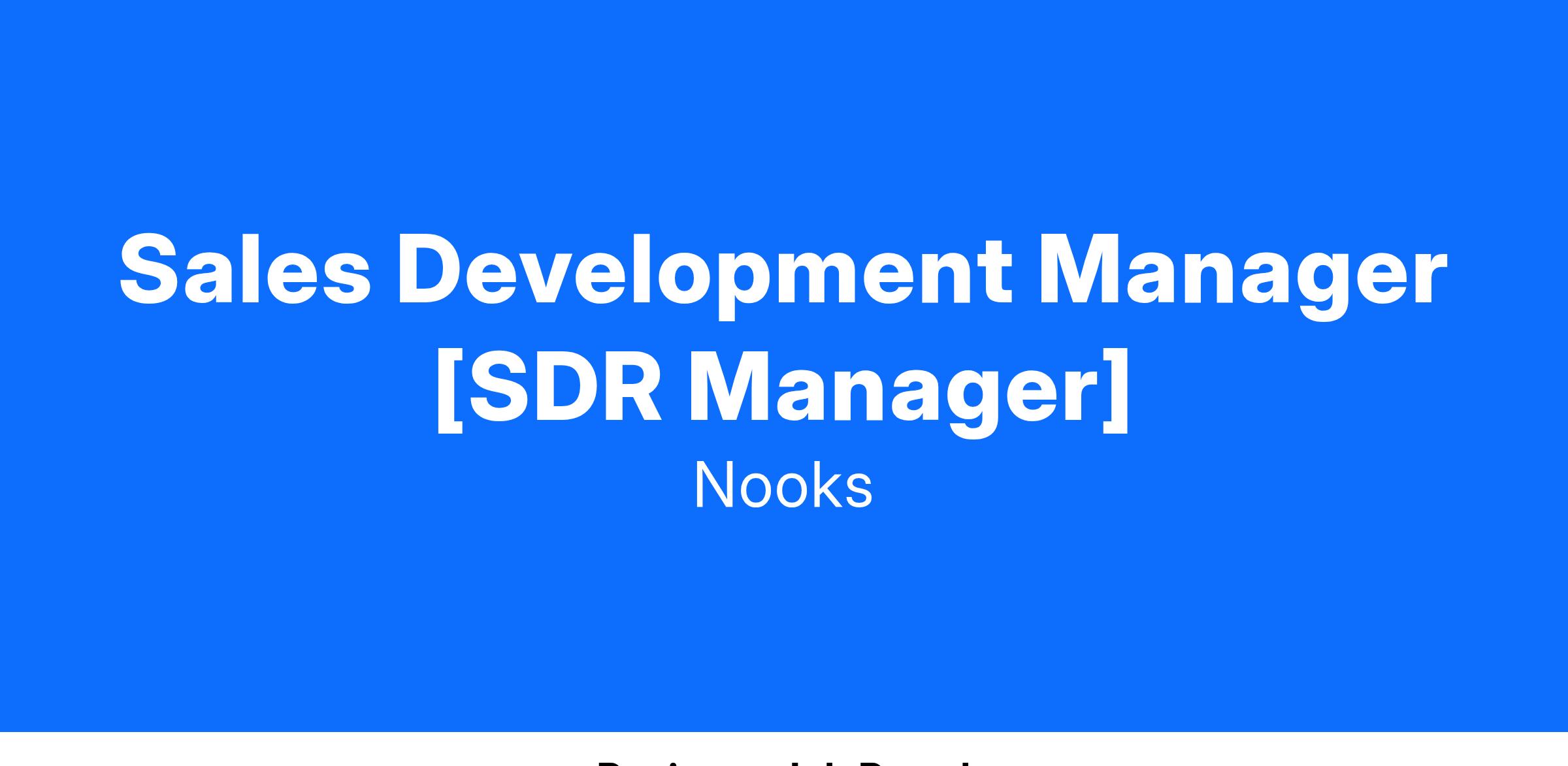 We’re looking for an experienced Sales Development Manager to lead one of our Mid-Market SDR teams! Reporting into the Head of Sales Development [Under Marketing], you bring 3+ years experience managing a high performing outbound SDR team, in a B2B SaaS org, you shouldn’t be afraid to pick up the phone and have experience building outbound messaging through all prospecting channels - phone, email + linkedin. Working closely with marketing + sales leadership, you’re experienced with hiring, coaching and motivating an outbound focused team to hit and exceed pipe gen targets, in a fast paced startup environment.