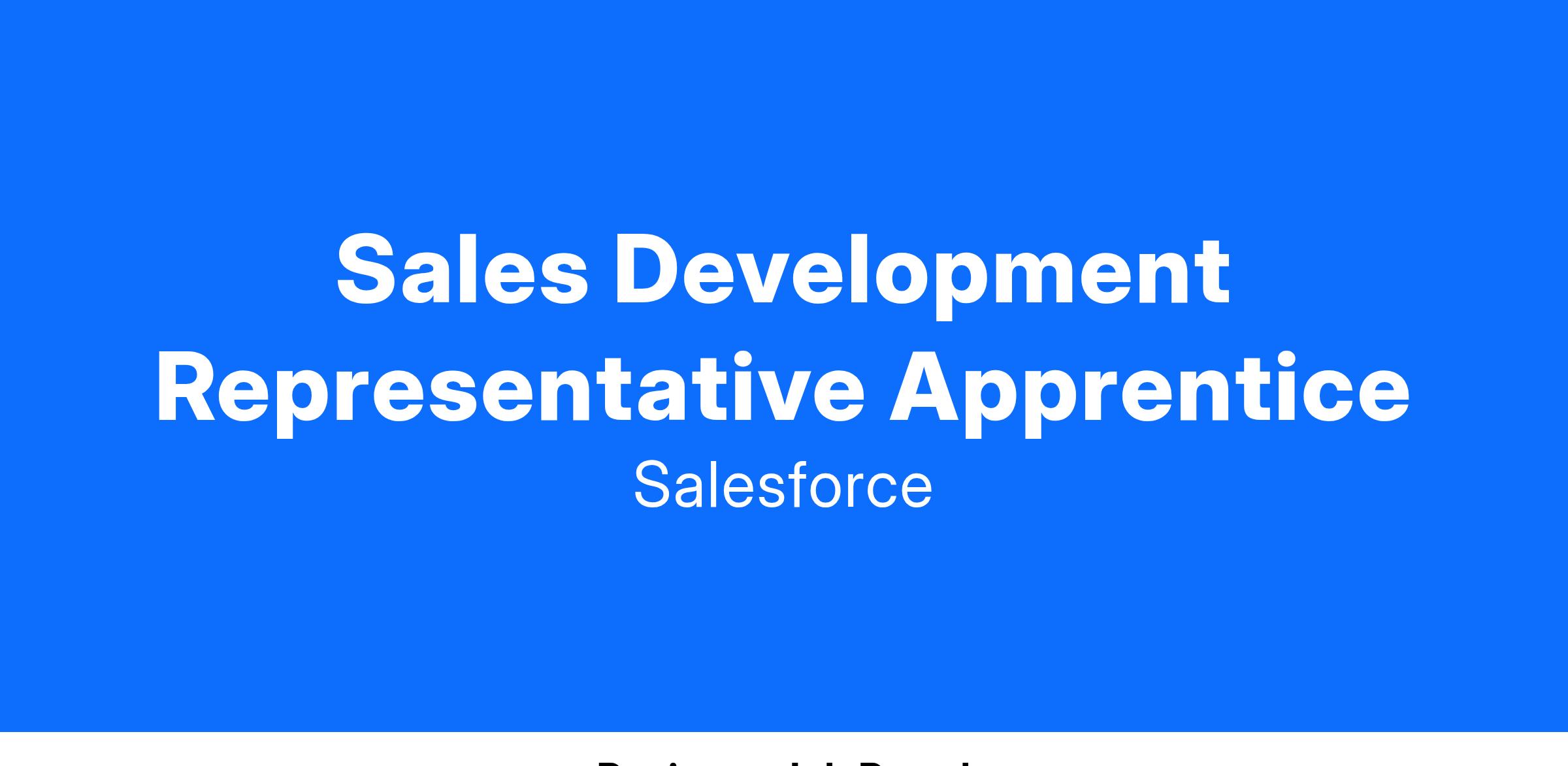 The SDR Apprentice Program at Salesforce is designed to develop high-impact sales skills and prepare you for a successful career in Sales Development. Our proven program provides you with the opportunity to learn from experienced SDRs and managers, gaining expertise in Salesforce solutions, solutions selling, and customer profiling. You will collaborate closely with our team to strategically target and engage prospects within the SMB market.