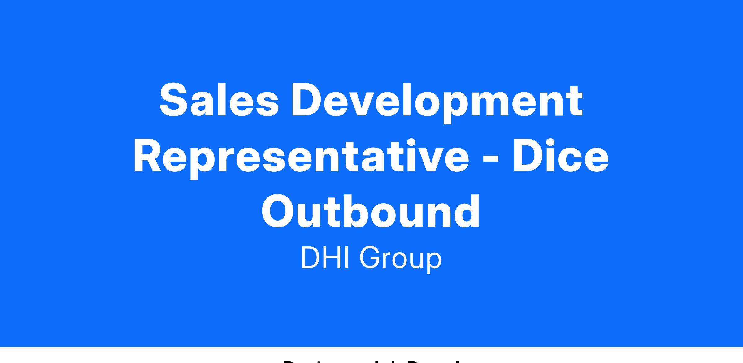 This role directly impacts revenue for yourself, the team, and for DHI. The goal is for you to be part of double-digit revenue growth for our next fiscal year and beyond. You will play an integral part in the overall success of the business by prospecting marketing qualified leads to our Account Executives that drive new clients and provide benefits to the candidate community by offering new roles that may only be available in the Dice marketplace.