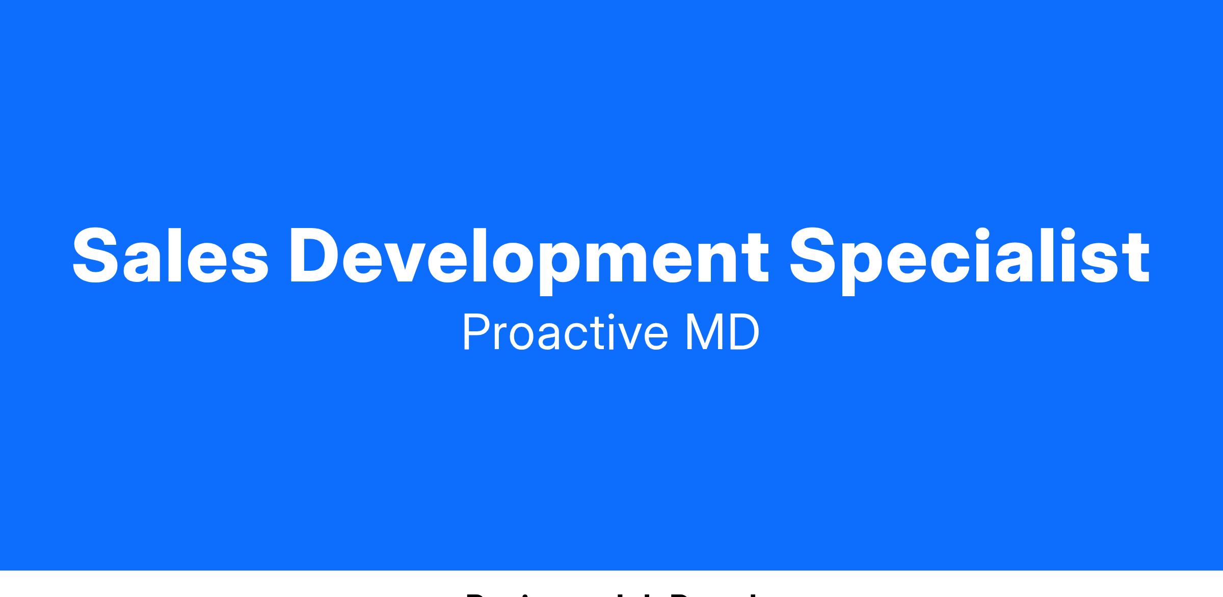 People are the company’s greatest resource, which is why caring for patients and keeping them healthy is so important. Proactive MD offers a comprehensive health management solution that extends well beyond the clinic walls. By engaging patients and offering them a personal relationship with a primary care provider, we can deliver measurably better outcomes, making people happier, healthier, and more productive while significantly lowering overall medical costs. We put patients’ health first because amazing care yields amazing results. JOB SUMMARY The Sales Development Specialist will be responsible for providing critical support to the sales team by managing sales data, optimizing sales processes, generating actionable reports, and assisting in sales forecasting. This individual will also play a key role in prospect outreach, proposal creation, and sales presentations, helping the sales team build and strengthen client relationships. Acting as a key link between sales, marketing, and other departments, the Sales Development Specialist will ensure seamless communication and collaboration to streamline workflows and drive team productivity. Additionally, this role will support relationship management efforts by maintaining regular communication with clients, addressing their needs, and ensuring a high-quality experience throughout the sales process.ESSENTIAL DUTIES AND RESPONSIBILITIES Sales Operations & CRM Management