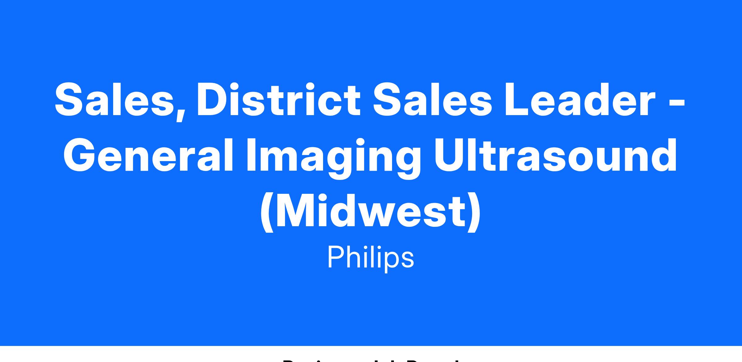 The District Sales Leader – General Imaging Ultrasound (Midwest) is responsible for managing the zone and meeting/exceeding monthly quarterly and annual Product and Support sales operating plans. They will be tasked with ensuring the sales reps collaborate to achieve all regional goals/objectives and creating solutions that meet customer requirements.