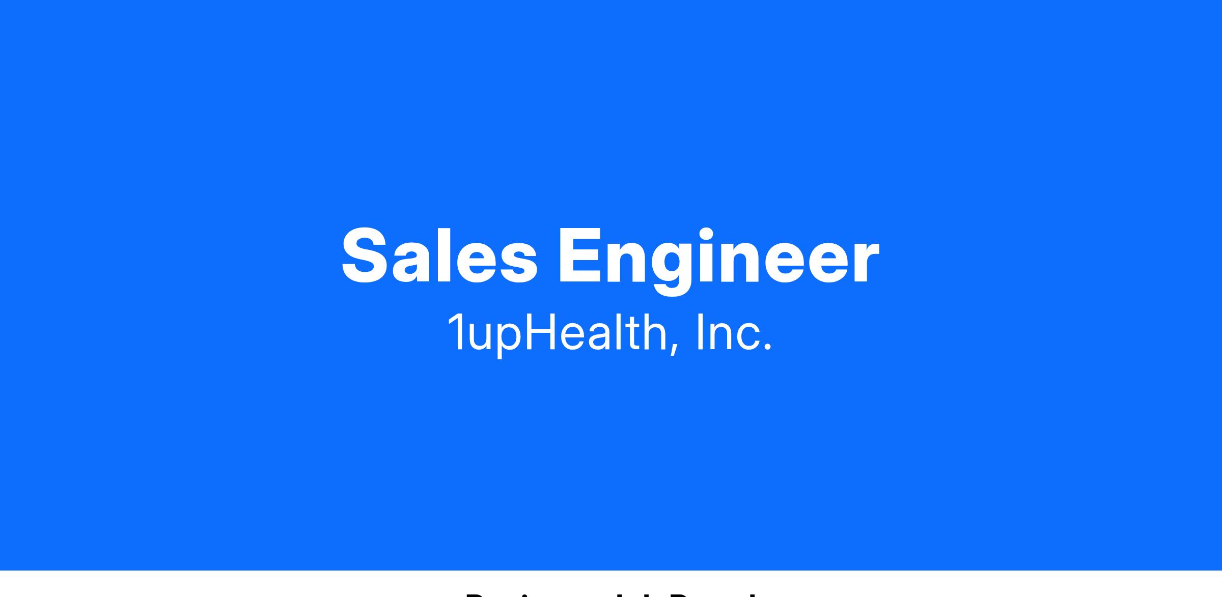 We are hiring a Sales Engineer to support the Enterprise Sales Team at our fast growing startup. Our sales team steers the organization in targeting new market opportunities for our products, pitching the 1upHealth brand and FHIR interoperability platform to healthcare leaders, and providing vital market feedback. The sales engineering team provides essential technical knowledge to our sales team, develops impactful demonstrations of our product offerings, and coordinates with internal teams on product roadmap and client implementations. This role will report to the Director of Sales Engineering.