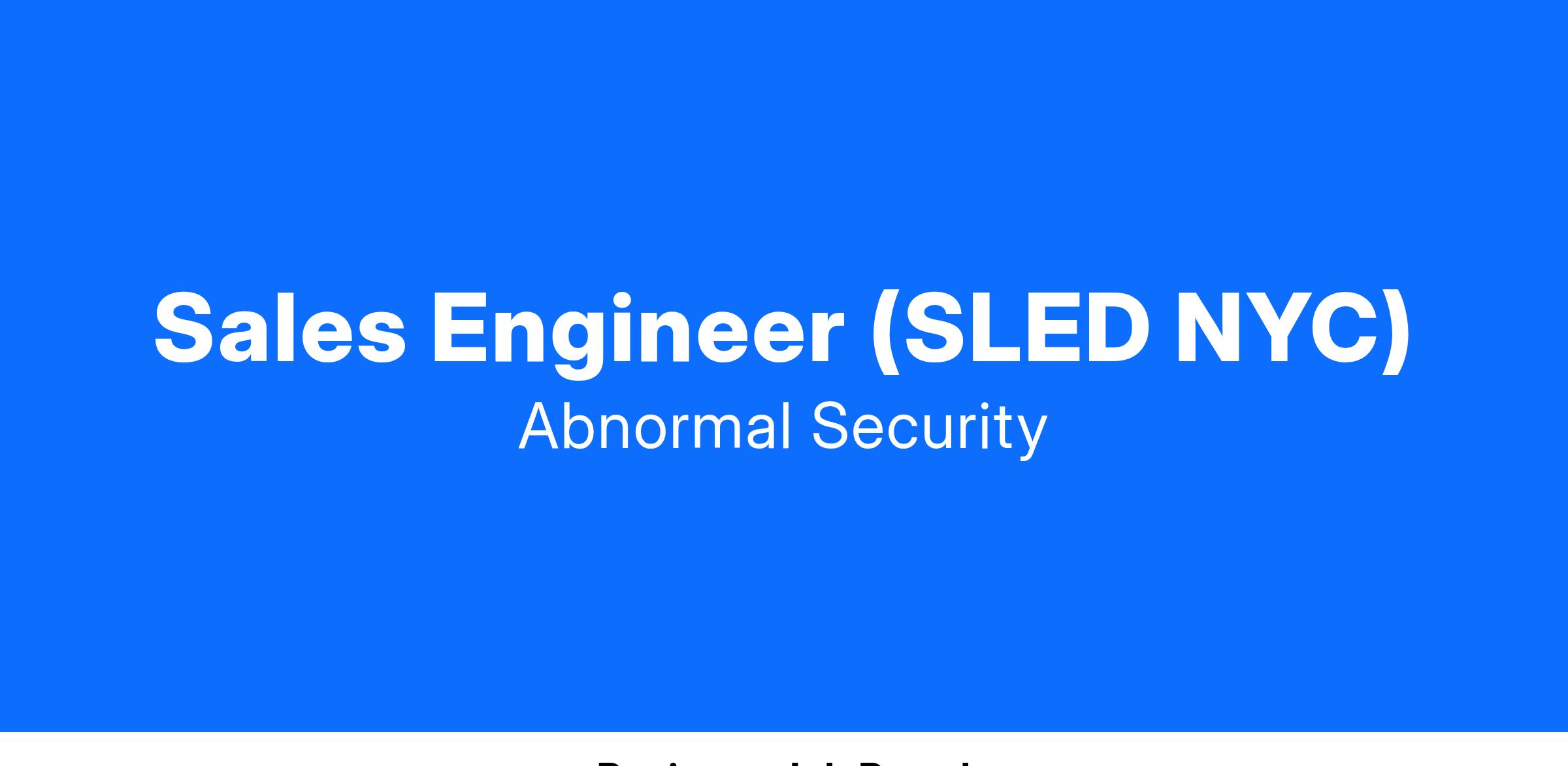 Abnormal Security is seeking an experienced Sales Engineer to join our growing SLED Sales Engineering team. As a Sales Engineer at Abnormal Security, you will be our customer’s technical contact, and craft strategic business cases to win customers over & help them conquer their most intractable email security challenges. In conjunction with Account Executives, you will be responsible for conducting in-person and remote product demos, articulating the technical value of Abnormal Security products, and driving successful outcomes for Proof of Value programs.