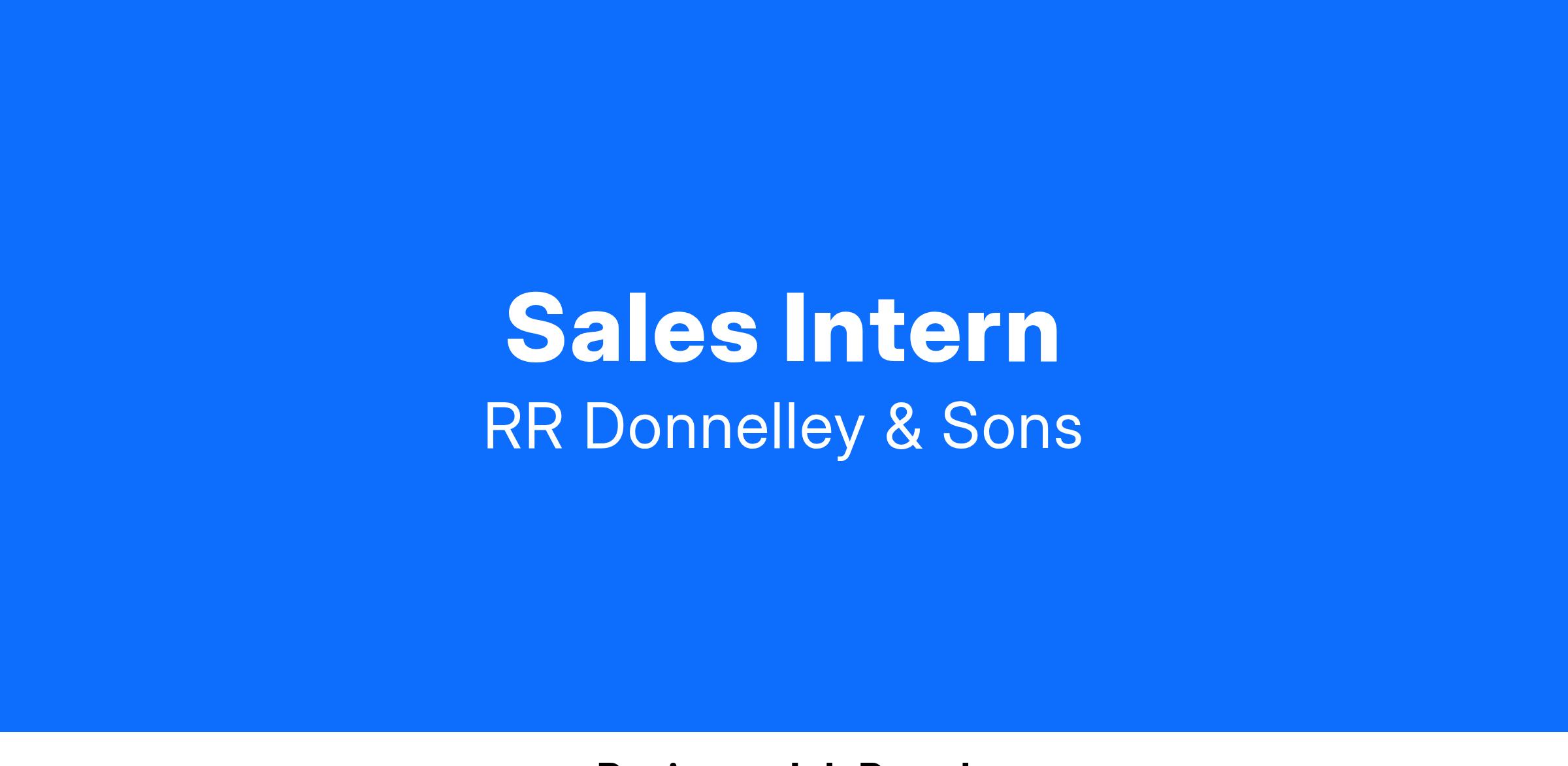 As a Sales Intern with RRD, you will gain experience through a "hands on" Internship which covers all aspects of the Sales process. Your Internship experience will not be traditional. You will be immediately integrated into your sales region as well as your Intern cohort, which consists of other sales Interns across the United States.
