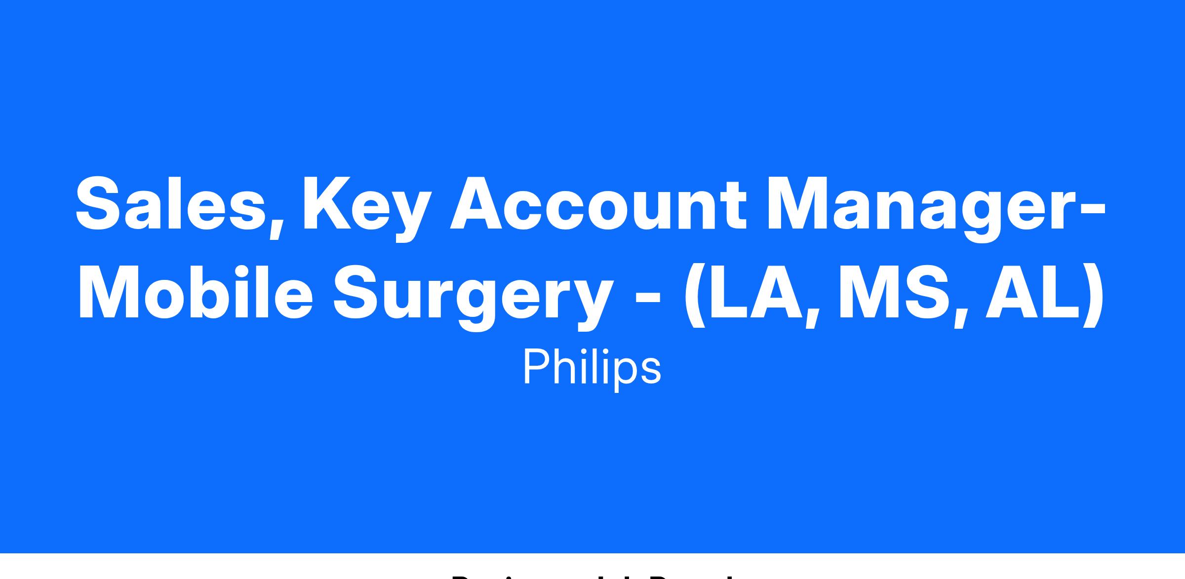 As the Mobile Surgery Key Account Manager (MoS KAM), you will be the primary point of contact for Mobile Surgery decision makers both inside and outside of the hospital. Primarily responsible for Mobile Surgery C-Arms and Services; identify, develop, and close MoS opportunities in Philips installed, competitive installed, and new construction labs and operating rooms.